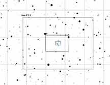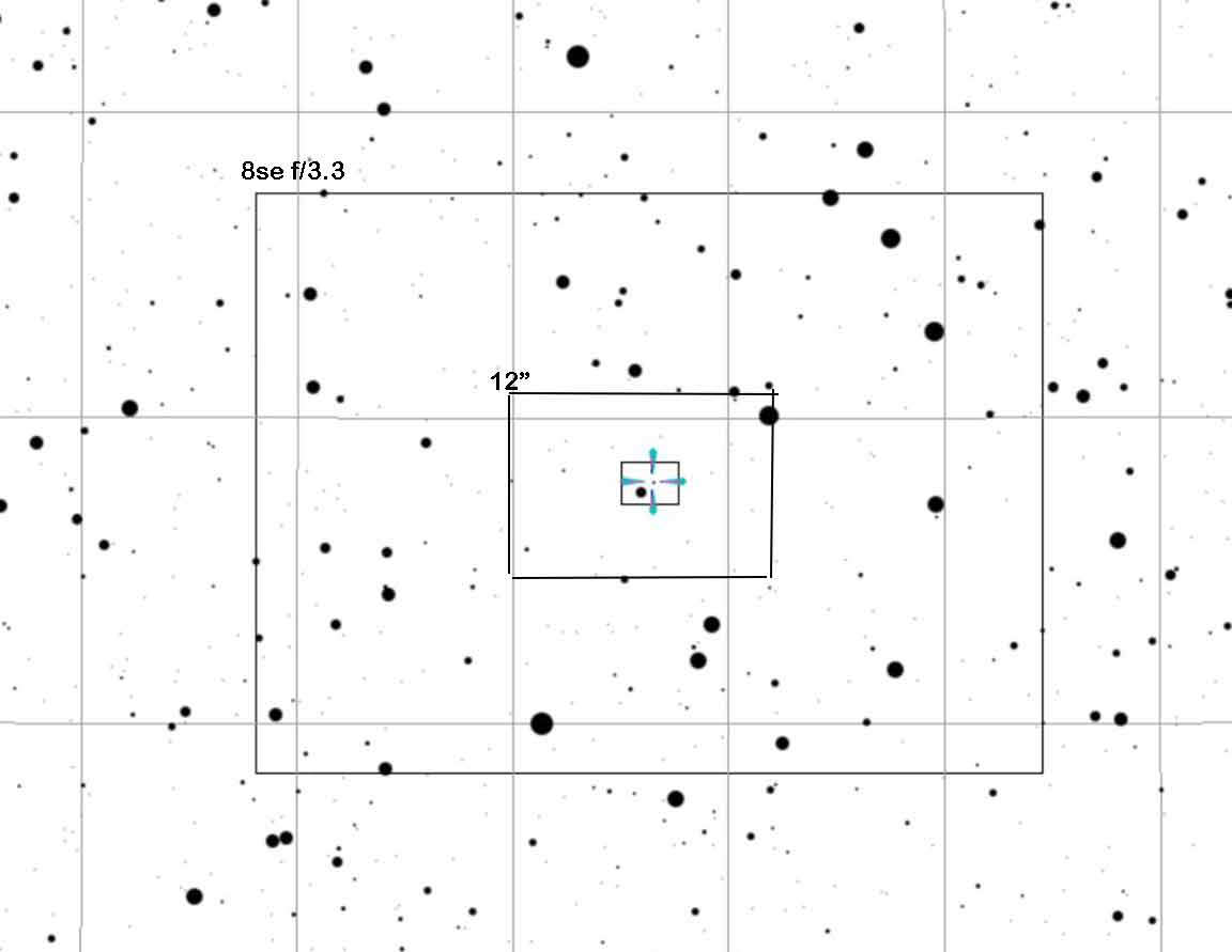Watec 910hx chip view from 12" scope at f/6.3. That should be 35% of the FOV on the 8SE at f/3.3, and both chip views are shown for comparison. Inner box is what I should see. Will have to get scope on target using SBIG camera and the swap in the Watec, if I have time. |