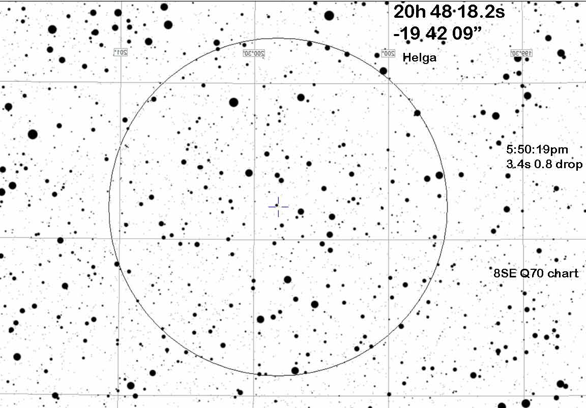 The OWc page says the drop is 0.75 in V and 0.9 in R. For our Watec, that means a drop of about 0.8 magnitudes, which means the target Helga is 14.9 magnitude. In V (?) OWc says Helga is 15.4 though. UCAC4 gives the magnitude (I correct to Watec mag) of 14.8. So, not totally consistent depending on source, but looks like a combined ~14.0 magnitude. But it drops for a good 3.4s and this is a low numbered asteroid with a good orbit and we're well inside the path for all of the Team Santa Cruz from home. We should get a solid 3s of drop and 14.0 should be detectable at 32x. Even 64x would give 3 points inside the occultation. From the 12", I will likely get it at 16x.