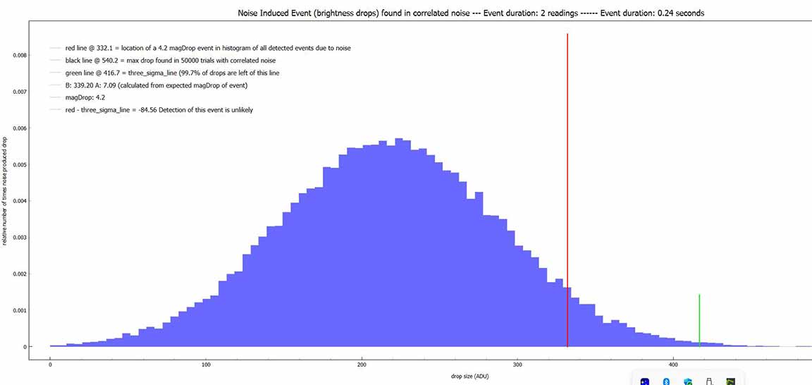 This is the NIE test for a 0.24s (single integration) 4.2 mag drop, as predicted and observed. It does not meet the 3-sigma level, but it does meet the 2-sigma level. |