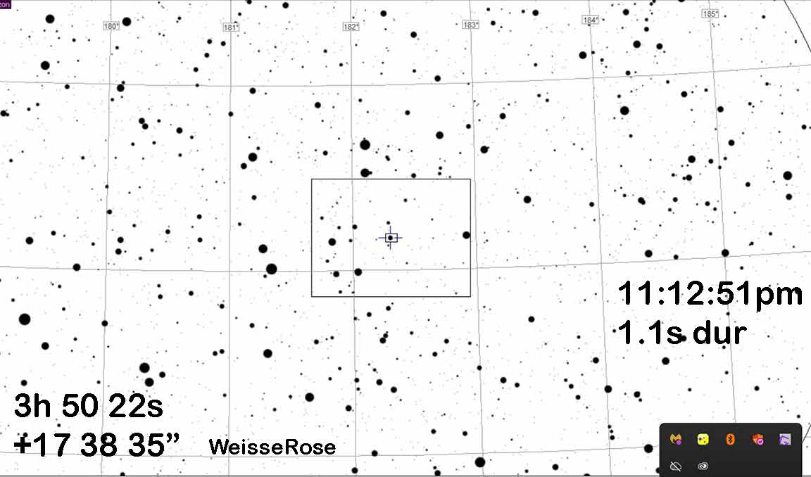 I tried this from home, but after all the work at the Observatory where I tried 1999WF, and trying to get stuff done with Jordan and the 12" and Will, I didn't get home till just 20 min before the event. I tried to get on-target but worried the 70 degree altitude would be a problem. I did not recognize any of the star patterns in either the eyepiece, or once I put in the Watec. Puzzled, because afterwards as a test, I sent it to M42 Orion Nebula, and it put it right into the center of the Watec field. Either the stars were very out of normal brightness, or some cloudiness unnoticed affected the patterns, or pointing near zenith was bad while elsewhere was OK... or something else. I got no data