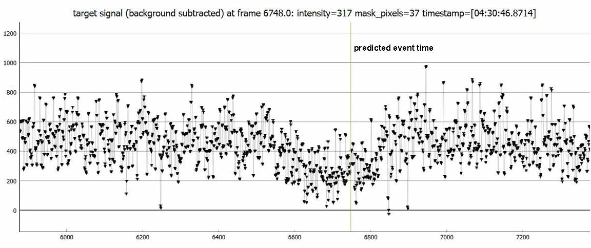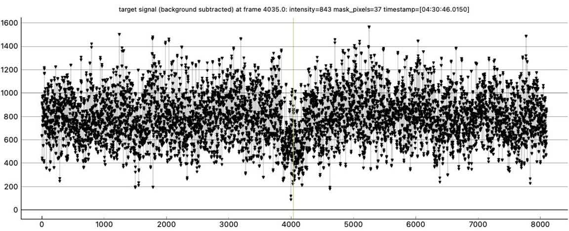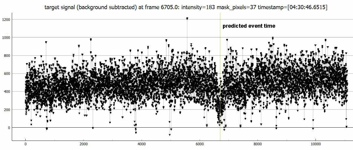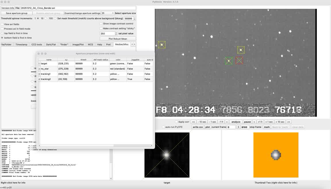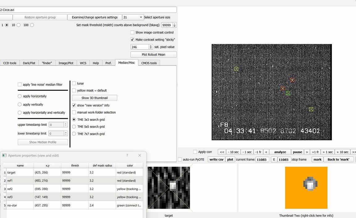 I expanded the mask to 3.2px to account for the blurrier stars. I also did not use the median horizontal and vertical filter this time in PyMovie. There were a few drops to zero in the light curve. Too many to be real, and occultations were partial anyway. Still I will check to see if any line up with Kirk's data.