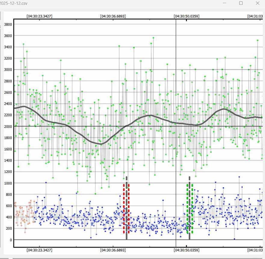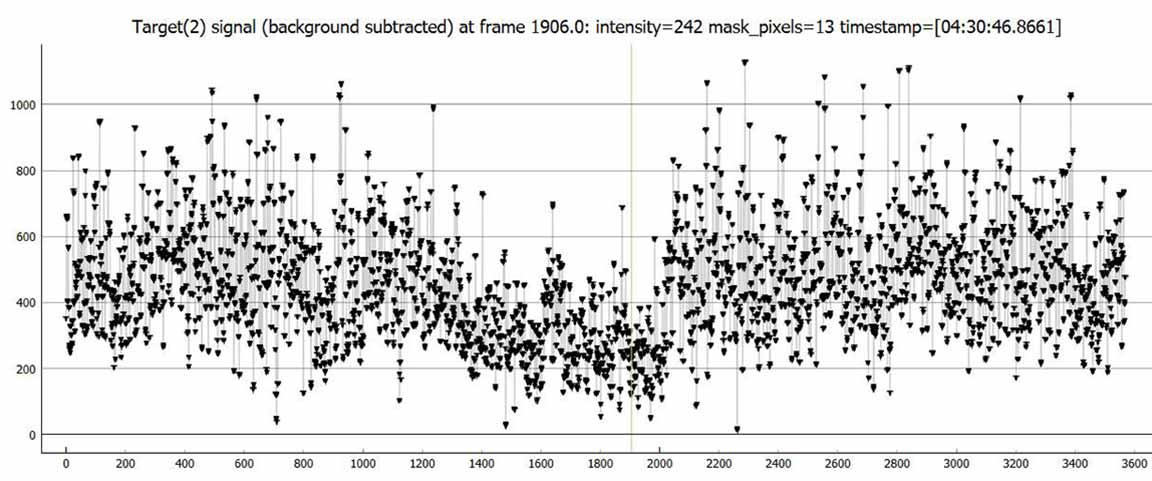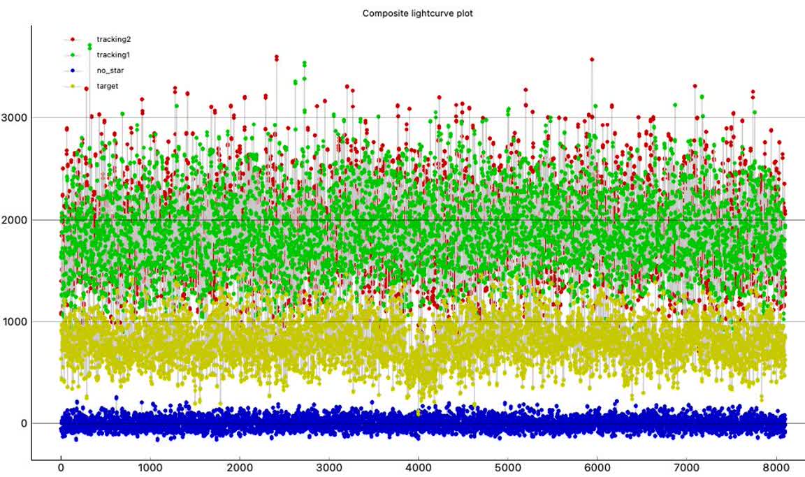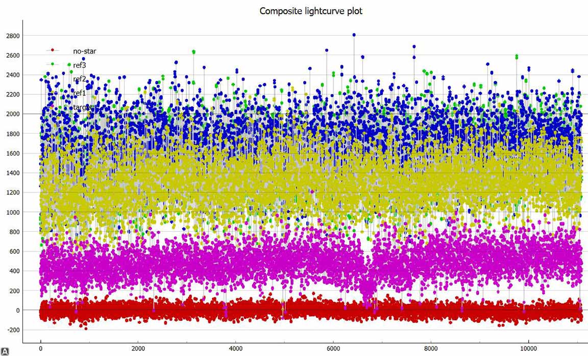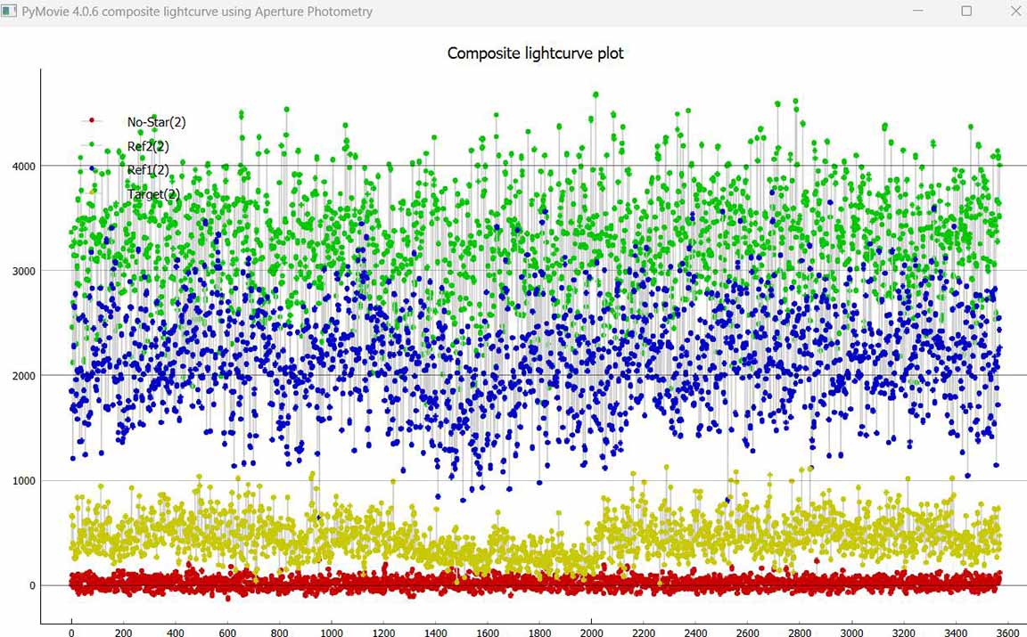 I expanded the mask to 3.2px to account for the blurrier stars. I also did not use the median horizontal and vertical filter this time in PyMovie. There were a few drops to zero in the light curve. Too many to be real, and occultations were partial anyway. Still I will check to see if any line up with Kirk's data.