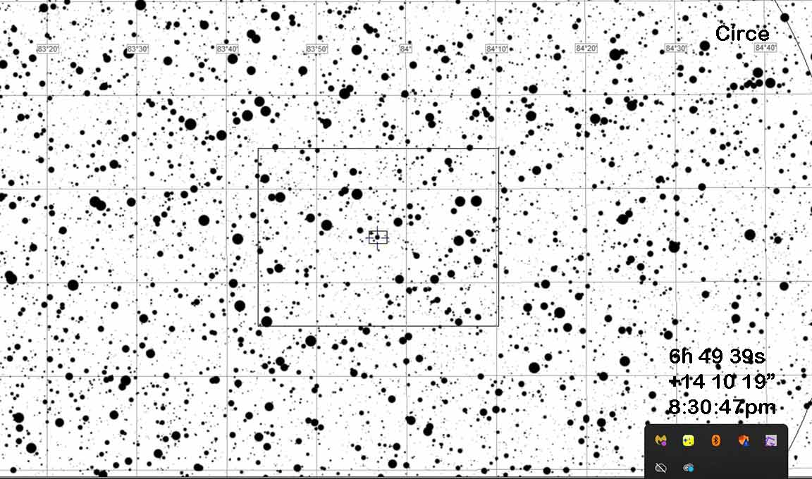 This is a moderatly difficult event and will require care in settings of your camera. Circe is V=12.4 and the target star is W=12.6, so the drop is 0.5 mag from total magnitude of 11.8. The object will drop from 11.8 down to 12.3 or so and stay there for about 10s. The altitude is low; 20 degree in the NE in Gemini