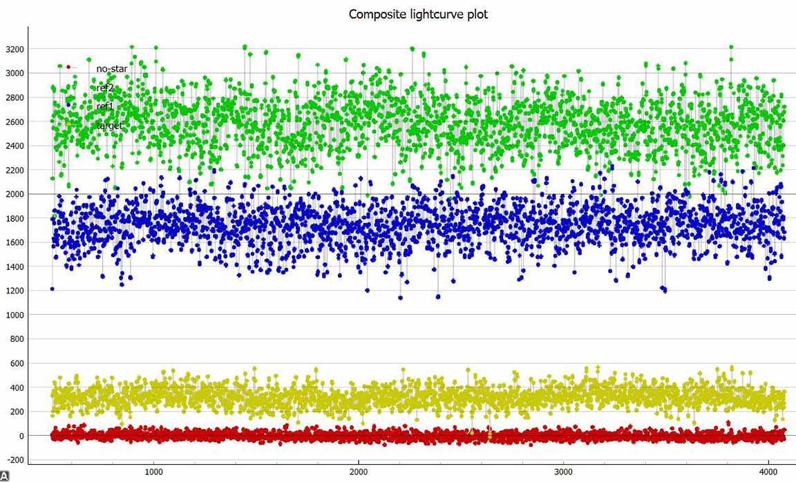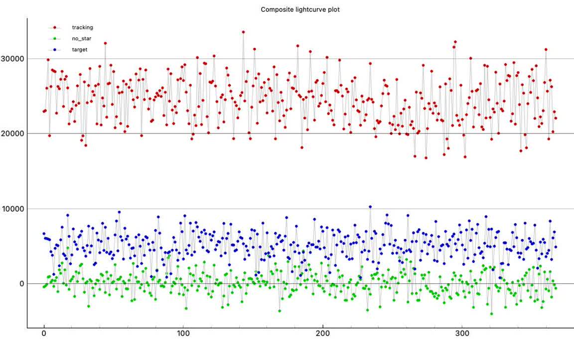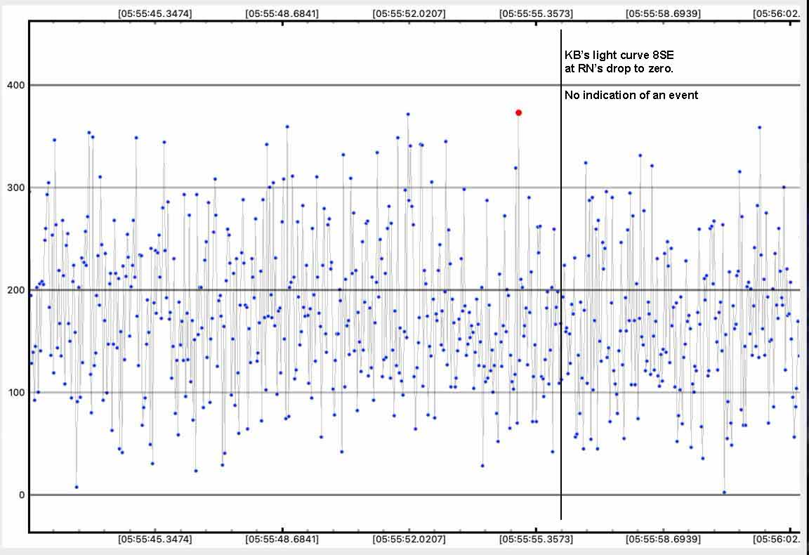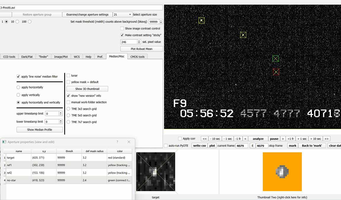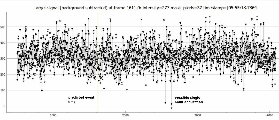 I recorded from home outside my carport. The star was fainter than I expected at 2x, so I went with 4x. It looked like a miss as I watched on the computer screen. Indeed, during the reasonable event period it was a miss. However, there was a single point drop to zero 18 diameters later, at 5:55:54.8982 on the PyOTE time listing. PyOTE says a drop of 4.8 mag for 0.08 seconds was detectable. The NIE curve that it gave had only 1.4 sigma of significance. A visual look at the aperture box at that time shows a faint detection of the star it seems, so it was not a tracking error. But was it a real occultation? It's a marginal detection at best, and rather far from the main asteroid at 18 diameters. The light curve point before the zero point was also low, but not significantly low. The duration of ~0.08s is 1/25th the diameter of the main asteroid and so it no competition for being the main object.