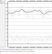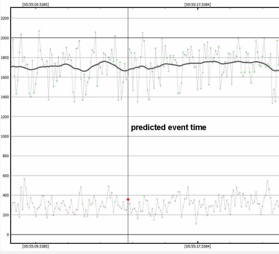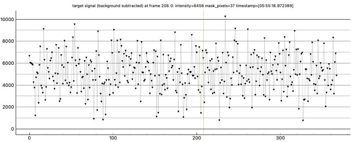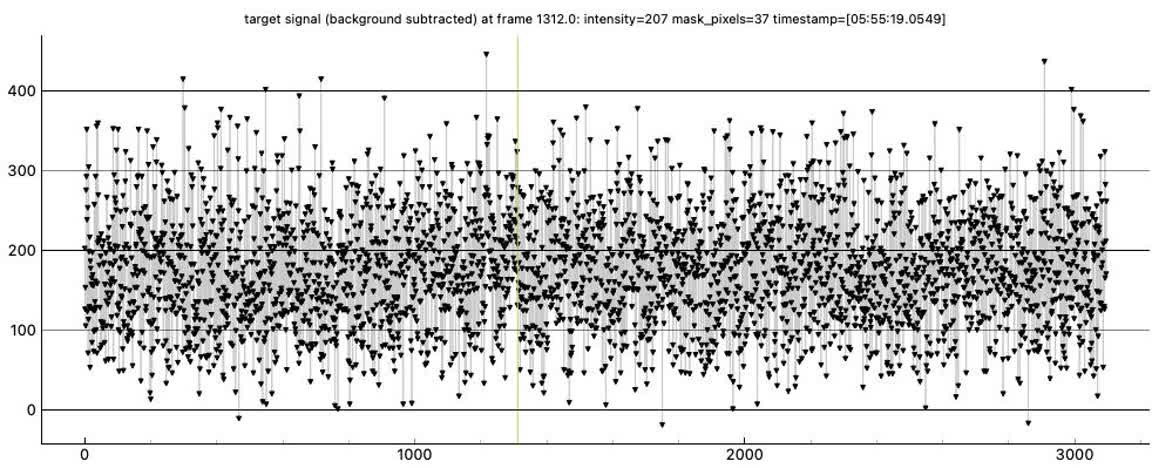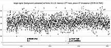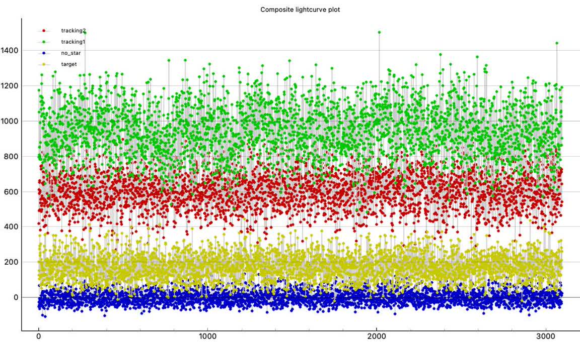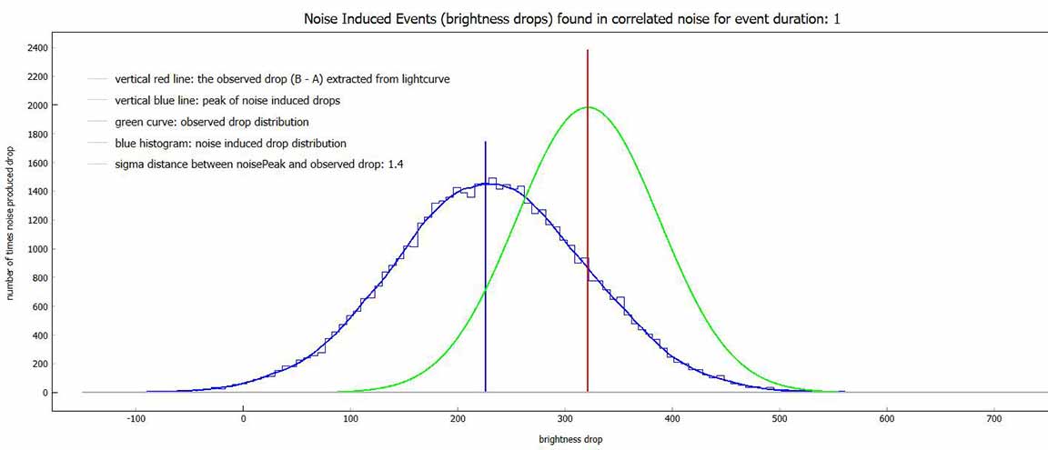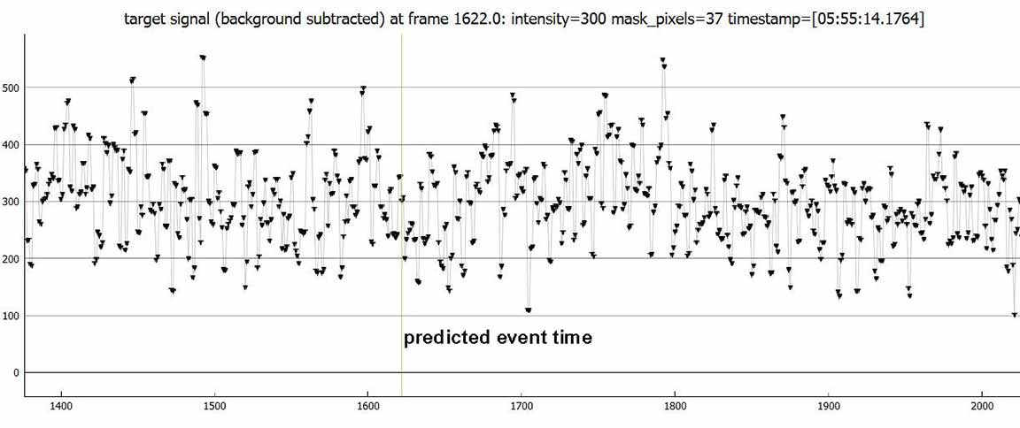 I recorded from home outside my carport. The star was fainter than I expected at 2x, so I went with 4x. It looked like a miss as I watched on the computer screen. Indeed, during the reasonable event period it was a miss. However, there was a single point drop to zero 18 diameters later, at 5:55:54.8982 on the PyOTE time listing. PyOTE says a drop of 4.8 mag for 0.08 seconds was detectable. The NIE curve that it gave had only 1.4 sigma of significance. A visual look at the aperture box at that time shows a faint detection of the star it seems, so it was not a tracking error. But was it a real occultation? It's a marginal detection at best, and rather far from the main asteroid at 18 diameters. The light curve point before the zero point was also low, but not significantly low. The duration of ~0.08s is 1/25th the diameter of the main asteroid and so it no competition for being the main object.