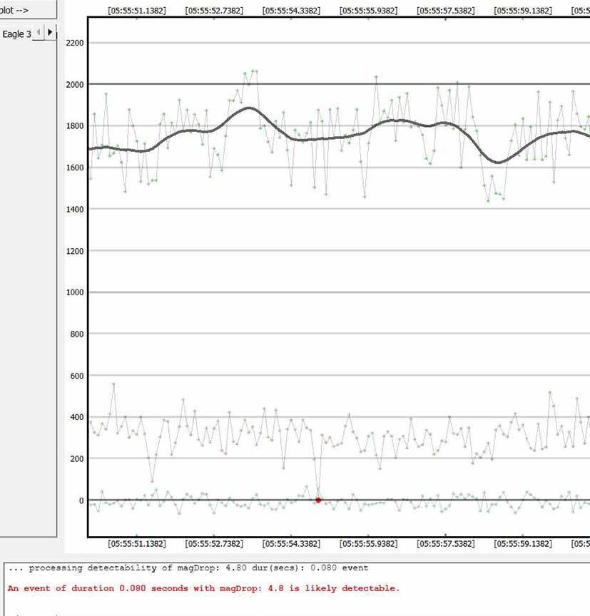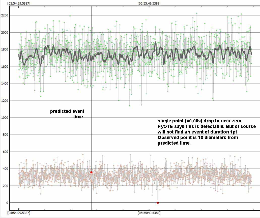 For Pinotti on Dec.12, I set up he Astrid at home, 5fps (12x), and the Watec at Westlake, 2x. Both got misses. For the Astrid, station 1, PyOTE detectability test said an event as short as 0.600s would likely be detectable, max predicted was 2.2s. For the Watec, station 2, PyOTE detectability test said an event as short as 0.170s would likely be detectable.