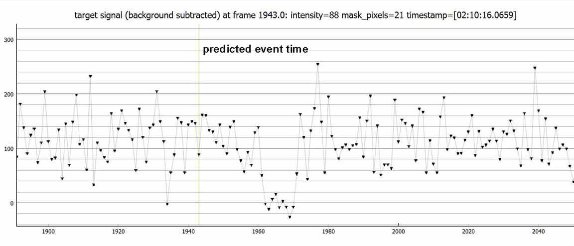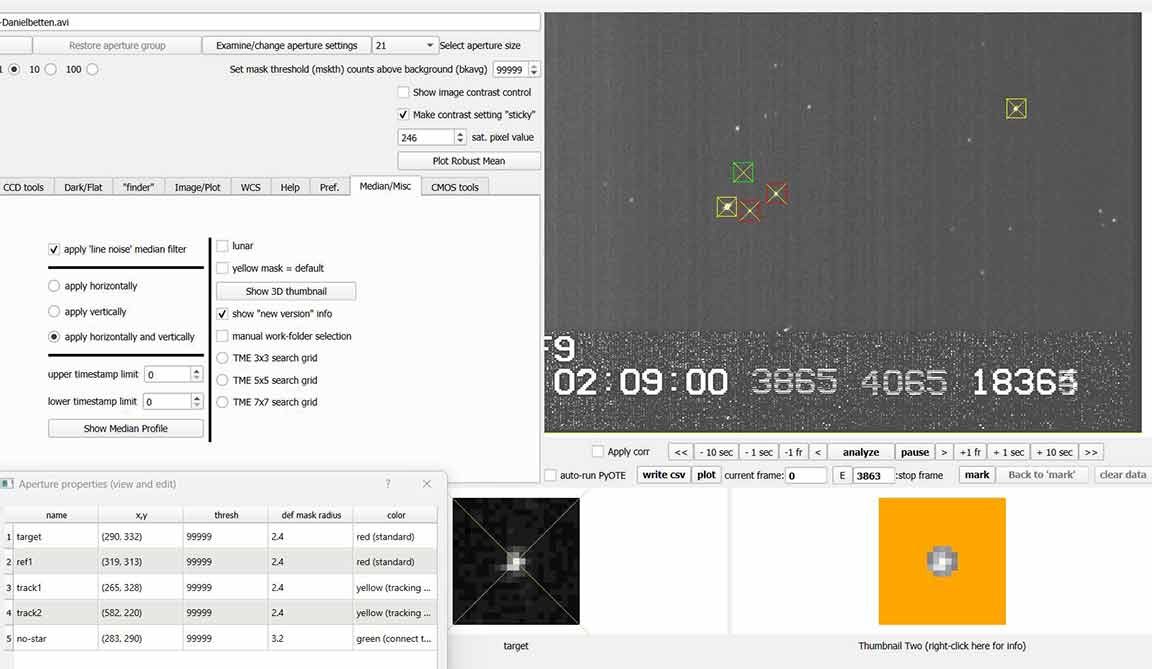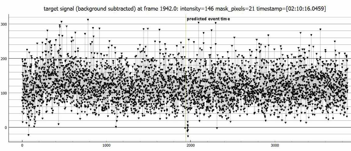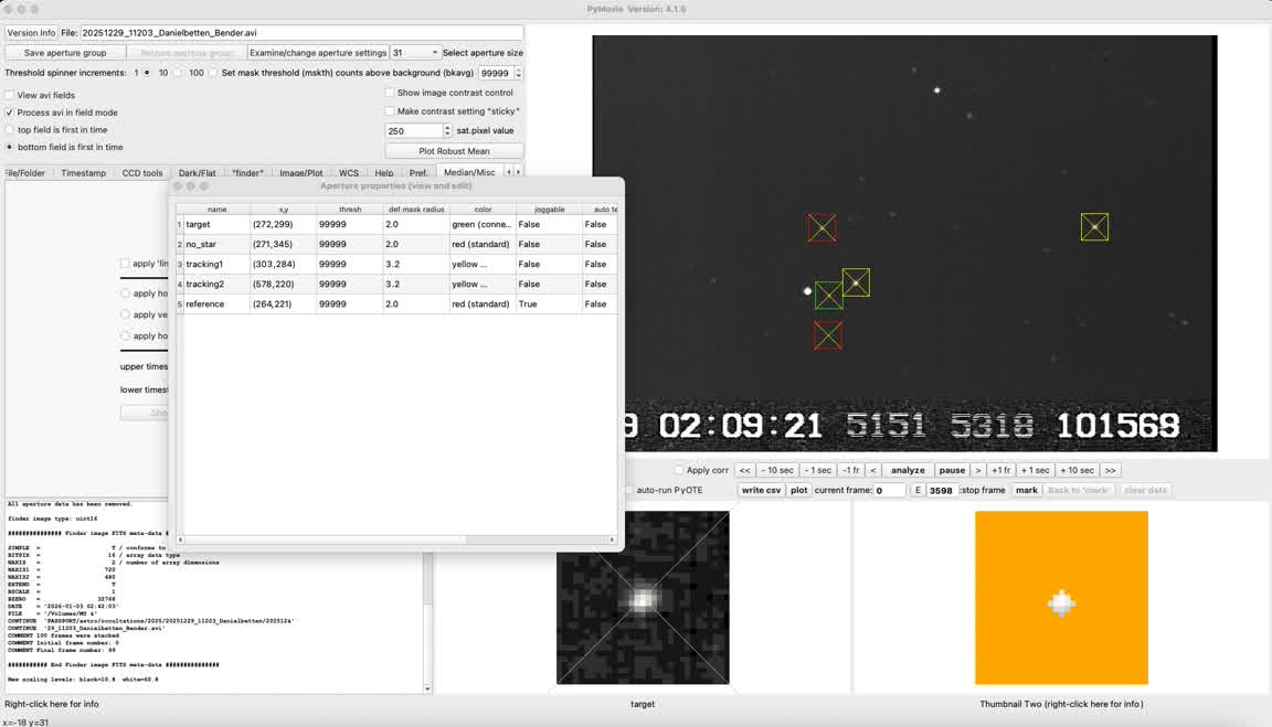 I got a 0.3670s event for Danielbetten, 1x on Trafton rd. in Watsonville. Target curve is noisy, but I got a NIE sigma distance of 10. There was some wind setting up, so I took off the dew shield, but fortunately it was calm during the recording and PyMovie tracked well with static apertures, I got the best results with a size 2.0 static mask for the target. I tried dynamic apertures but got better results with static.