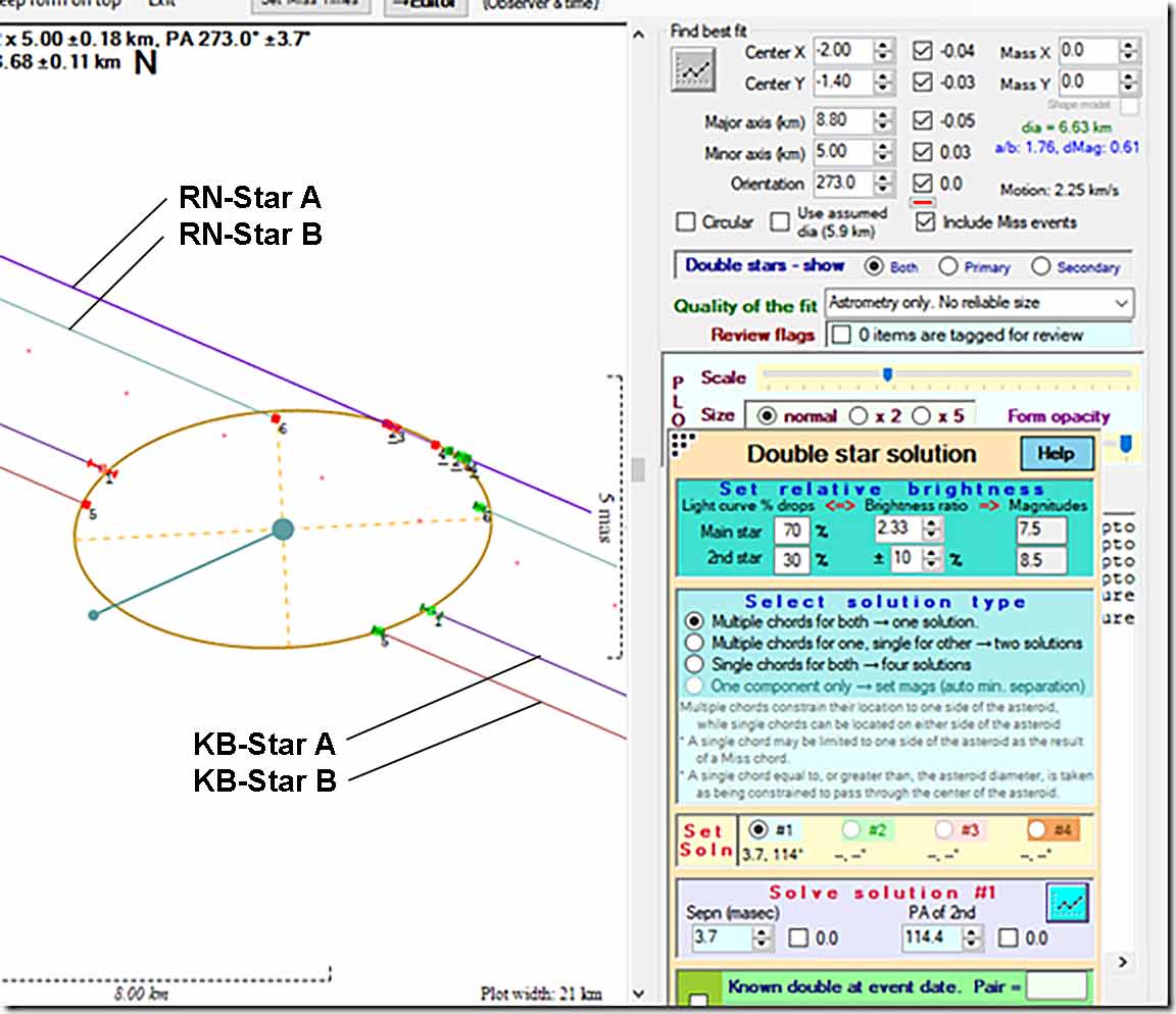 Dave Herald optimized solution fit to a perfect ellipsoid and got this, rather similar to mine. He'll include the double star parameters in a new paper on double stars discovered by occultation. |