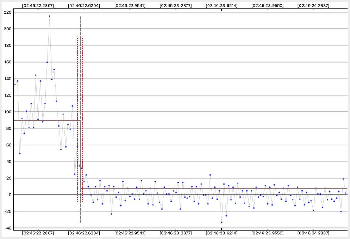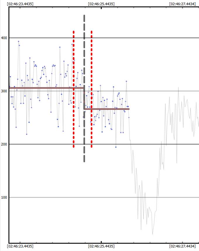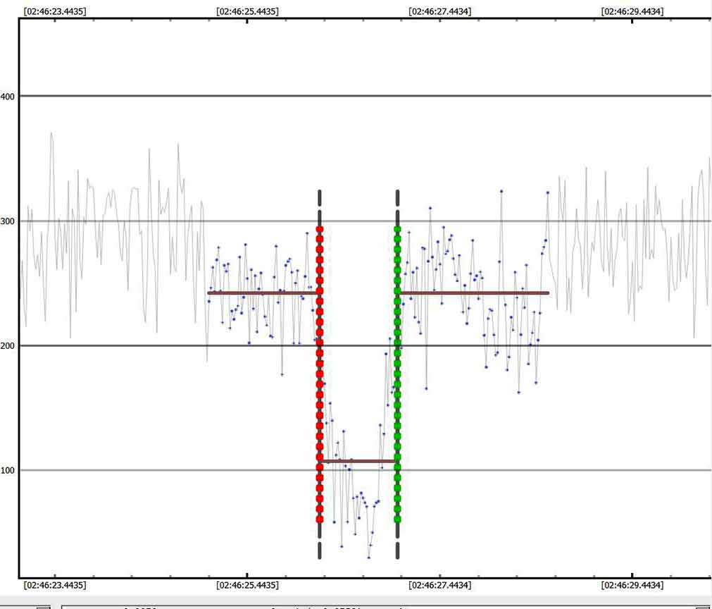 Disappearance of Star B is judged to be 1/2 way down the light curve from the level determined from the occultation of A, which is consistent with Kirk Bender's Star A brightness of 71% the total combined brightness. I was unable to get a long enough number of data points for the time from the D of star B and the beginning of emergence of star A to get a timing determination from PyOTE. PyOTE kept trimming out the entire light curve with each attempt to limit the interval to just a very few points. So instead, I am determining the time graphically by finding the moment when the image fades to 0.5 of the faded (missing Star A) level, which is at level=0.5 x 85 = 42. This is at