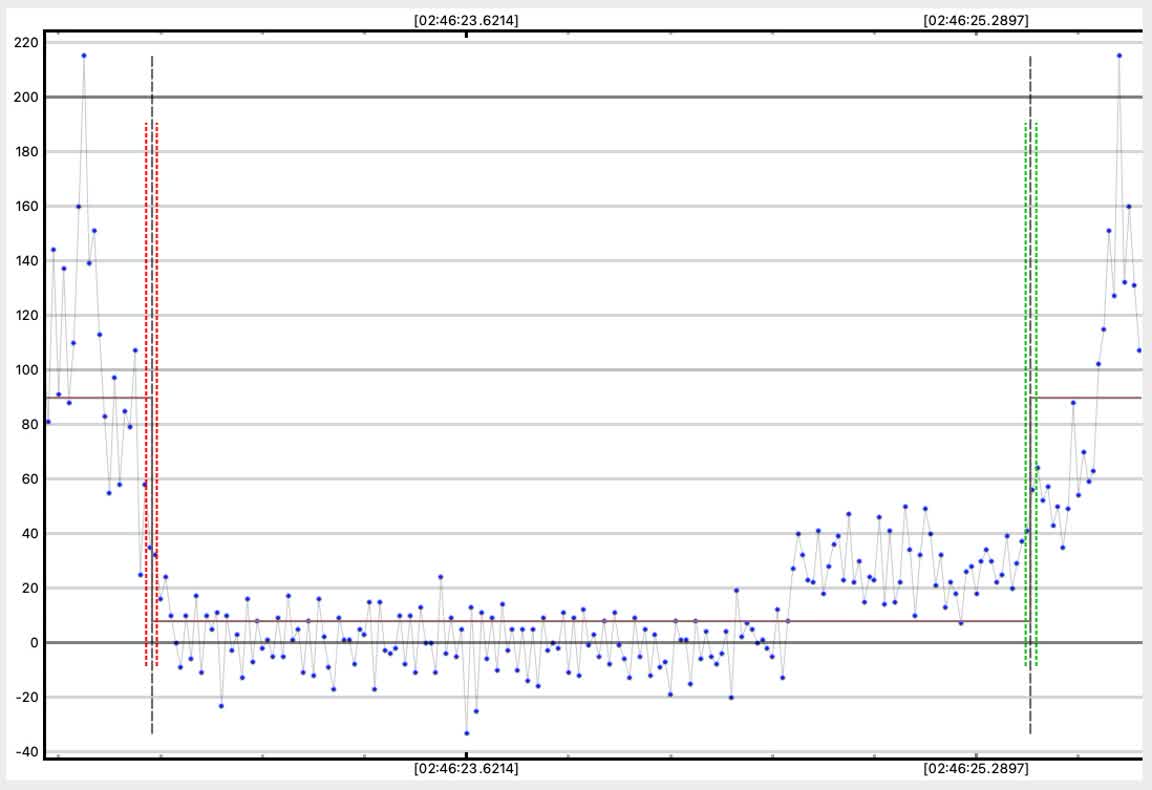 PyOTE determined the occulted level after Star A disappeared as shown, but Bender's 29% of full value, applied to the consistent level before the D, gives a lower value = 71. I took the average of these two levels as the basis for then deciding when Star B was half occulted, and that is the uncorrected time for Star B's disappearance. Then the drop to value=30 at minimum, and then Star A began its reappearance... |