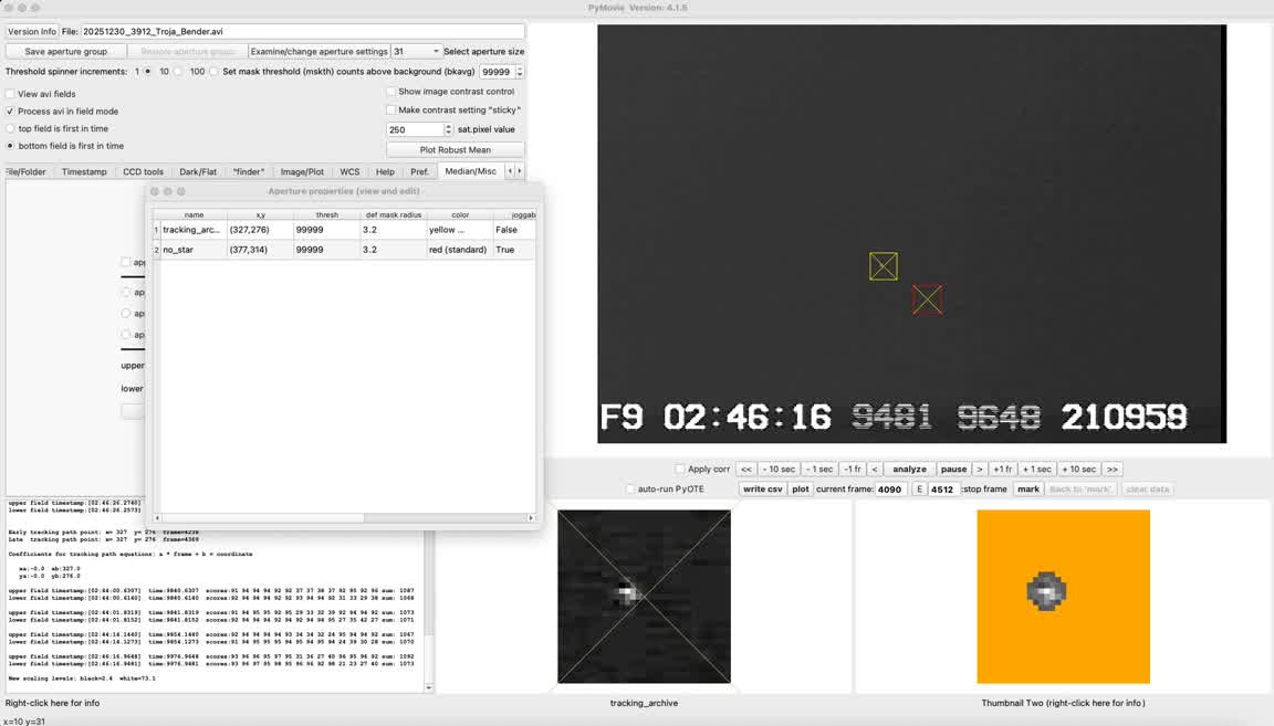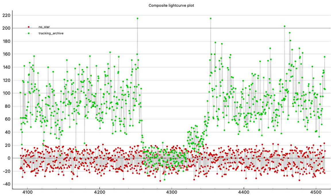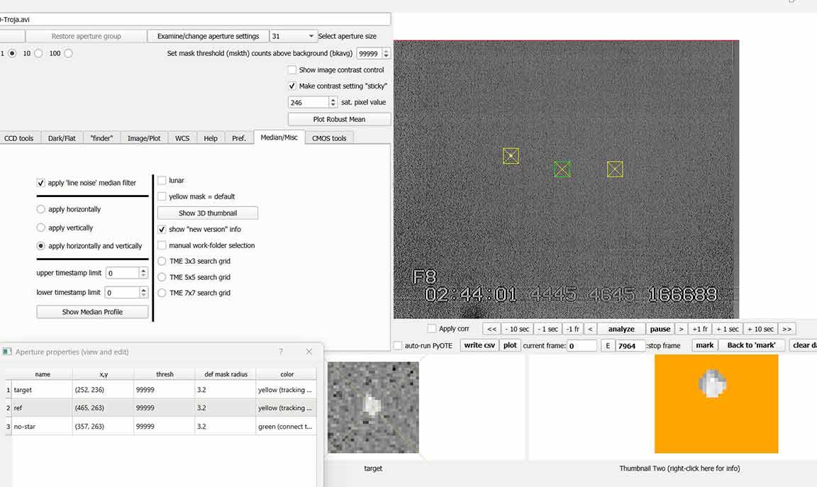 I did not adjust gain; I left it at Watec 910hx max=41 as usual. The star was a bright-ish gray ball but it did not look to have saturated pixels. And indeed on reduction it did not show any saturated pixels during the PyMovie run. All pixels looked light gray on the on-site recording Lenovo screen, not white. Sky was adjusted to look dark gray. The two nearest neighbor stars to the right were still visible, though rather fainter. The brighter of those two was good enough to use as a ref star and also as a tracking star.I asjusted the mask size to 3.2px which enclosed all the target star lit pixels but little else. The aperture box at 21 px. I let PyMovie use re-centering.