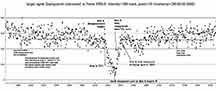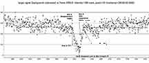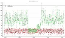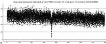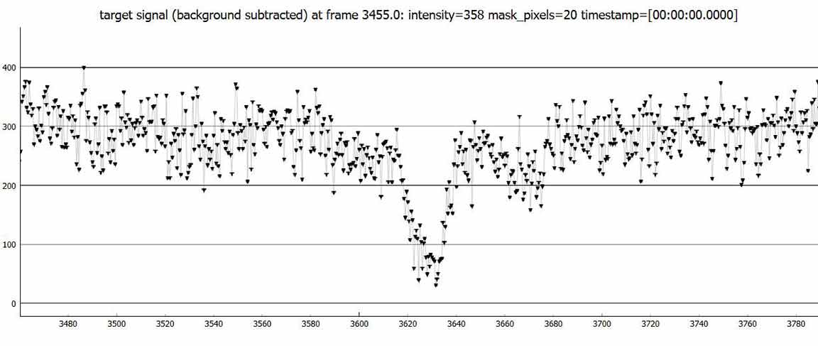 RN: But, could there be sawtoothing for such a bright star which spills over several rows and columns in its image? For me, I was not able to get the target star to look like a bright sharp dot, no matter how hard I tried to focus it. The star was very bright and large. My solution to avoid saturated pixels was to adjust the brightness/contrast in IOTA VC2.4, but since Kirk uses a miniDV camcorder, not direct to digital, this option is not available and he resorted to dropping the gain down to accomplish the saturation issue.
