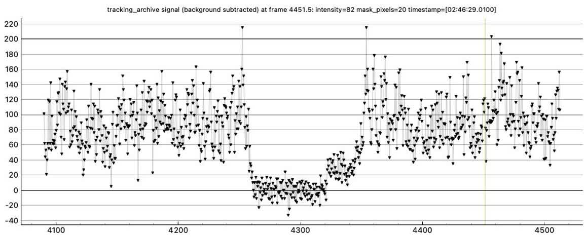 The target did not move between the D and R, so I did not need tracking at that interval, but pymovie will not analyze without a tracking aperture. I tried turning off re-centering but it still lost tracking on the R. However, pymovie supports two-point tracking, for recordings where the target drifts through a line but the target disappears. You go to a frame, add a tracking aperture on the target, set the aperture as the beginning point, then advance to another frame, center the aperture on the target and set it as the end point. It will then linearly interpolate tracking between the two points. So I put a tracking aperture and set it to one point just before and one point after the event, and did an analysis from 2 seconds before to 2 seconds after those two points. I analyzed and watched the mask and it stayed on the target for the entire analysis and it captured the R. The resulting D is somewhat gradual like before, but the R has a distinct step, above background, then returns to the baseline level target curve. There's even a little dip in the R step, probably noise, but maybe a graze? Also, there are high one point spikes right before the D and right after the R. This is a 1x interlaced recording so there is some sawtoothing as it alternates between odd and even lines, so those spikes could be noise but they are coincidentally right at the D and R.