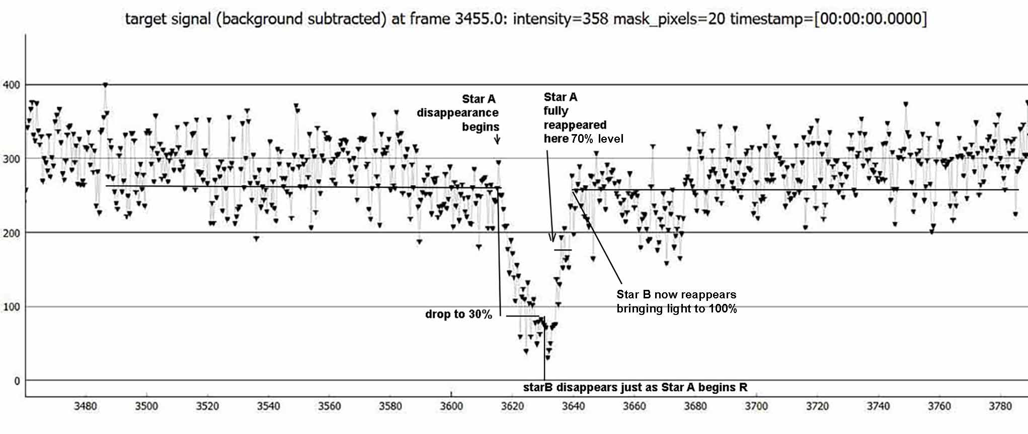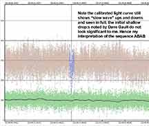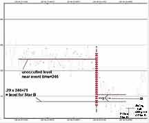 4. By making that assumption, I then get brightness levels consistent with Kirk's brightness levels; a 70% drop as Star A disappears, then the beginning of Star B's drop to zero but which is interrupted by Star A's rise out of its occultation. This then shelves fairly obviously on close up, to a level that is 30% below the unocculted level, as it should if this is Star B reappearing