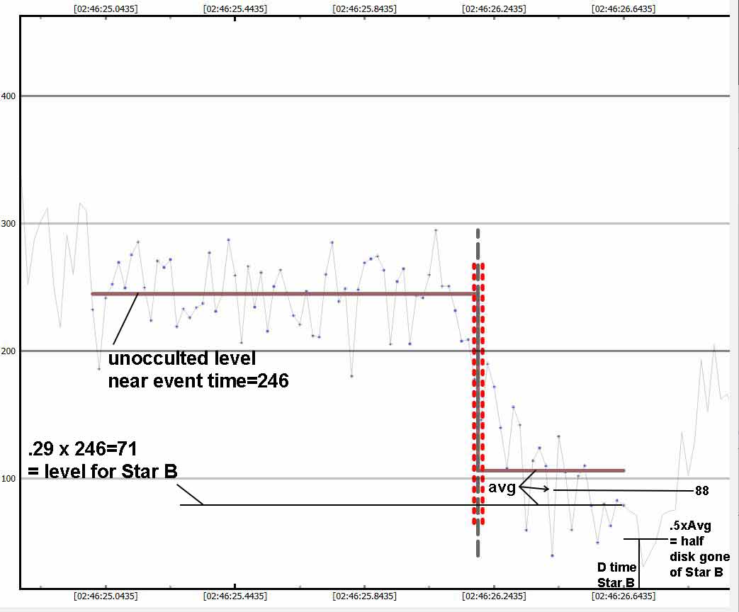 Kirk's data shows a much better determination of the brightness of star A and star B. Since we have identical Watec 910hx cameras and telescopes, I used his levels to guide my own analysis. Kirk's full un-occulted level on his light curve is 95, and when only star B is showing, for about 1s after the total occultation of both stars, his level is 28 on average.