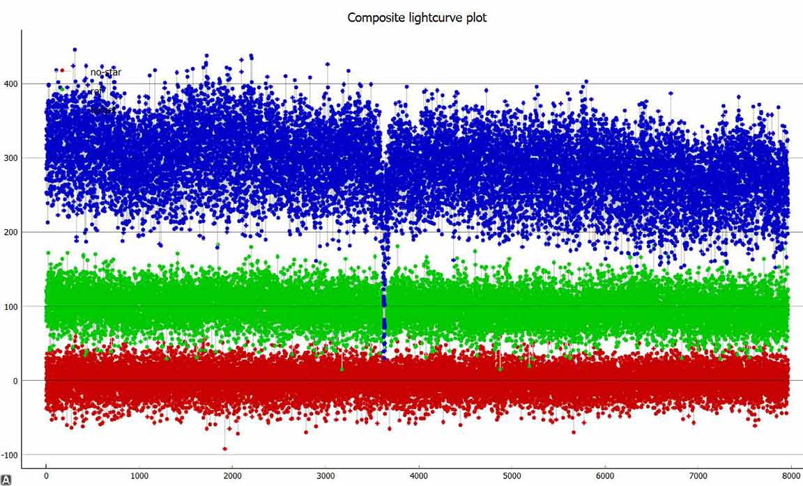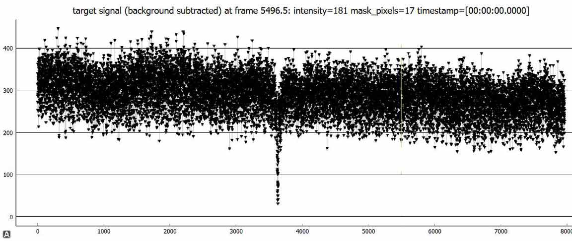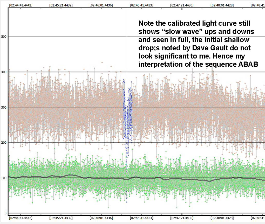 This (target) small gray ball was remarkably constant in brightness during the long recording, except at the event moment it faded to less than half brightness for maybe 1/2 second was my guess, or a little more.