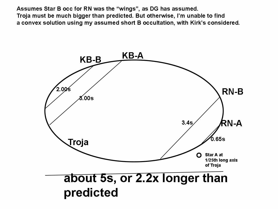 NO! It requires an unphysical long skinny/ bulbous appendage on one end of Troja. I experimented and could not find a shape and occ durations for our 2 stars x 2 observers that was physically plausible. However, Dave Gault's original proposal I also played with, and does make a reasonable solution. The asteroid isn't a perfect ellipse, but a general asteroid shape and tracks such as I've drawn are a reasonable approximation to what we observed... I was bothered by the long axis 2.2x longer than the nominal circular diameter, but if the asteroid is significantly ellipsoidal (it's small, a size where more oblong irregular asteroids are more common), then the equivalent circular diameter and albedo are not that unreasonable.