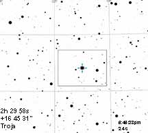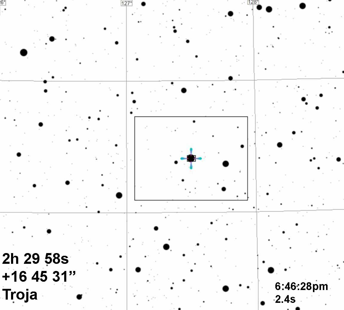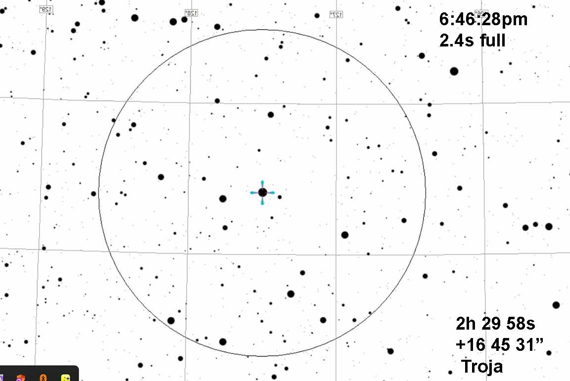 The shelf on the rise out of the deep occultation, which I initially attributed to star A being fully out and Star B still behind the asteroid, now is seen as due to a mountainous irregularity on the edge of Troja, as part of a grazing occultation. This isn't far-fetched at all. However, the final appearance of Star B is still a bit puzzling, since it looks that the full brightness does return and then stabilize beore dipping again for a half second. These half-second dips are not unusual for the unocculted light curve in my recording, but then the final rise to full brightness is only 13%. I get 13% of the light for Star B, which is only half the brightness of Star B seen in Kirk's recording. I don't have an explanation for that. It can't be a grazing effect because Star B is now seen as traversing near the long axis center of the asteroid, not a graze at all.