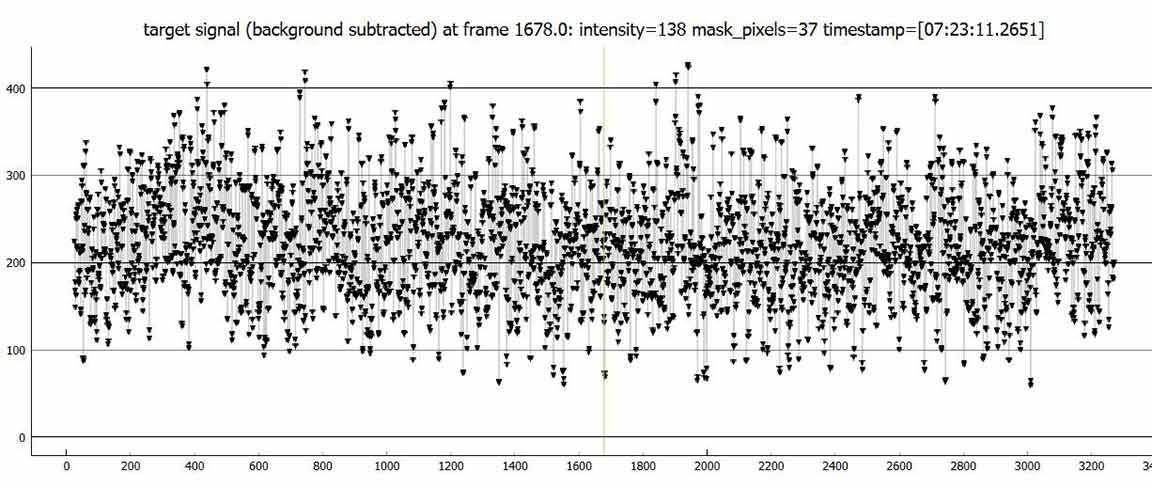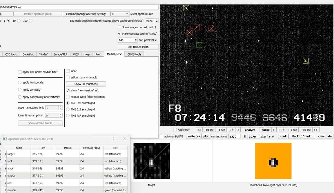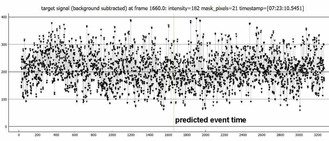 I got this one from home, at my carport. At 4x setting. Star was not as bright and easy as the magnitude suggests. 4x was marginal. Sky looked clear all around the target area during the recording, and the low gibbous moon should have highlighted any significant clouds. There were cirrus down in the east, but they were moving lower and further east and no new clouds were coming in from the west. I watched intently during the live event and it looked like a miss. Confirmed by PyMovie analysis.