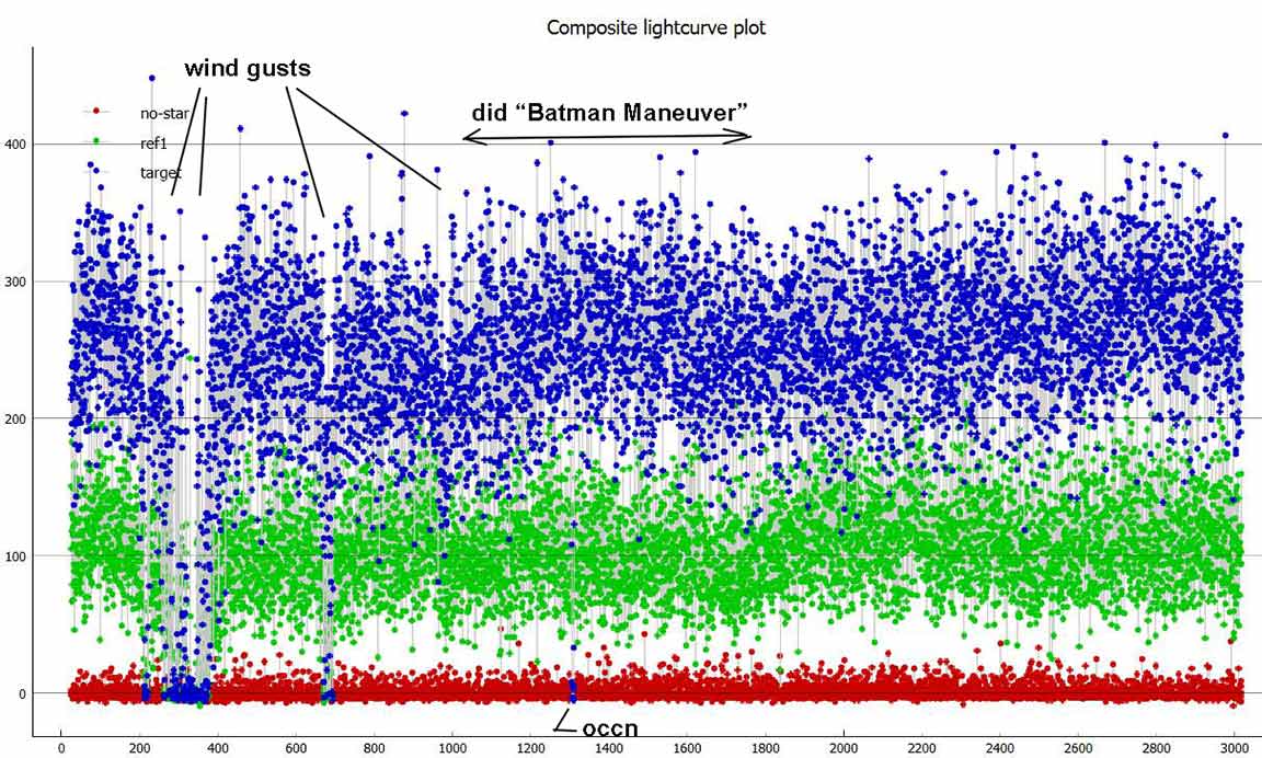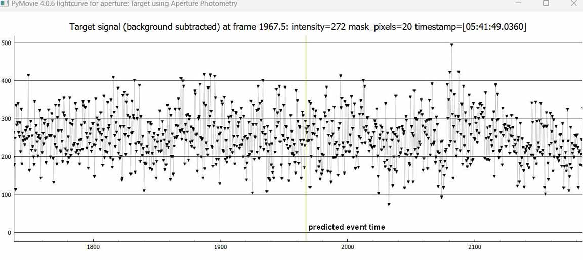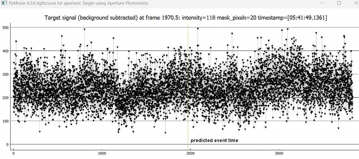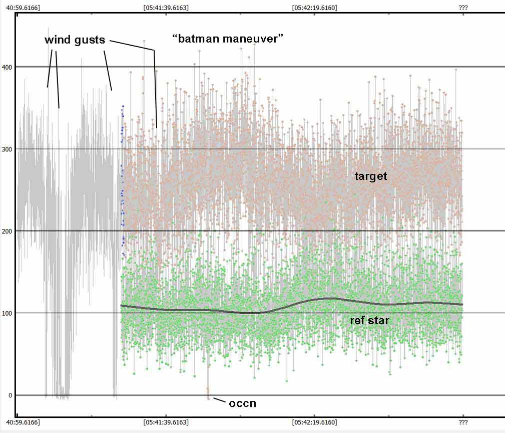 Looks like a miss for me for 1999 RL, 1x at the summit, on the A-frame deck. I know it was close to Rick's chord and he got a positive, but there's no sign of a dip in mine near predicted time. There is a one point upward spike near predicted time, higher than baseline and not part of an event dip, probably just coincidental noise, there was a lot of twinkling. I had some wind gusts at the beginning but it was calmer during the predicted event time. At first I tried all size 2.4 apertures in pymovie, but it lost tracking and didn't recover so I used 3.2 for tracking aperture and then it didn't lose tracking during the recording. I tried dynamic apertures and it lost tracking. Here are annotated graphs, I offset the tracking/reference star vertically for clarity in PyOTE. PyOTE detectability tool reported an event as short as 0.02s would likely be detectable, max predicted was 0.31s.