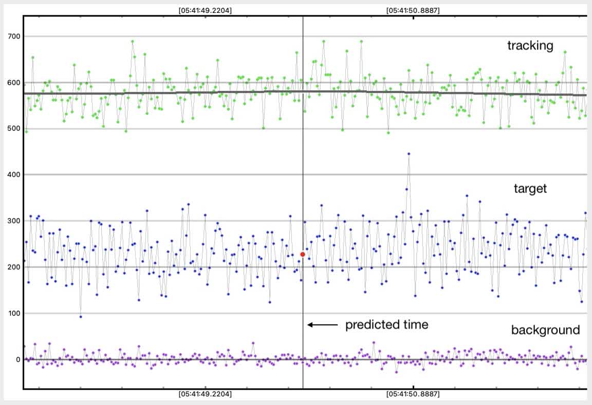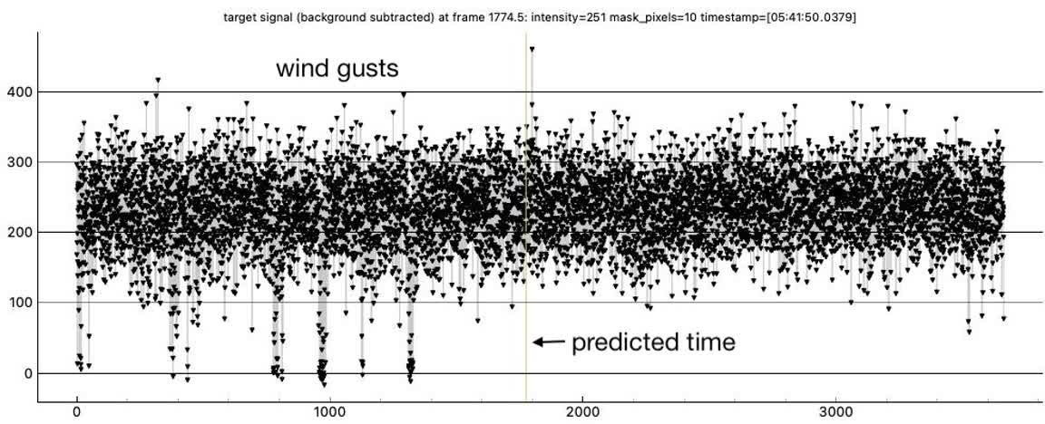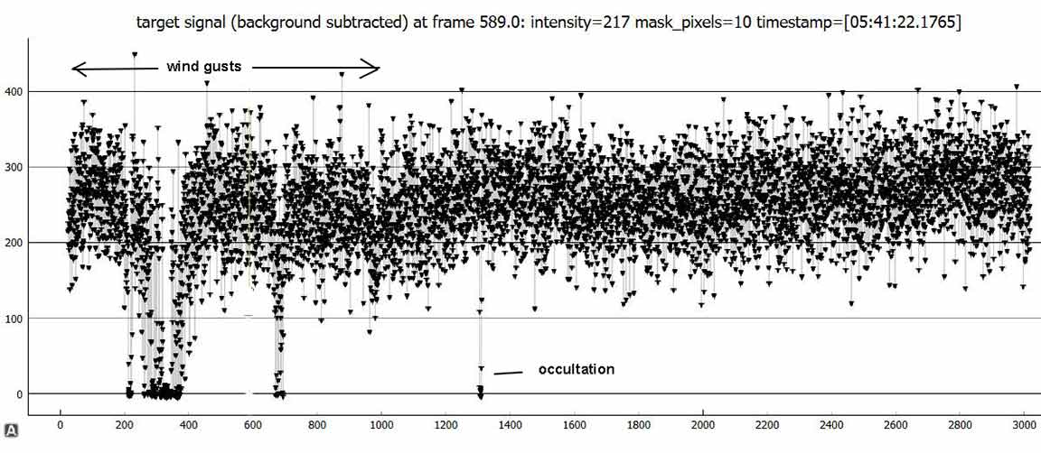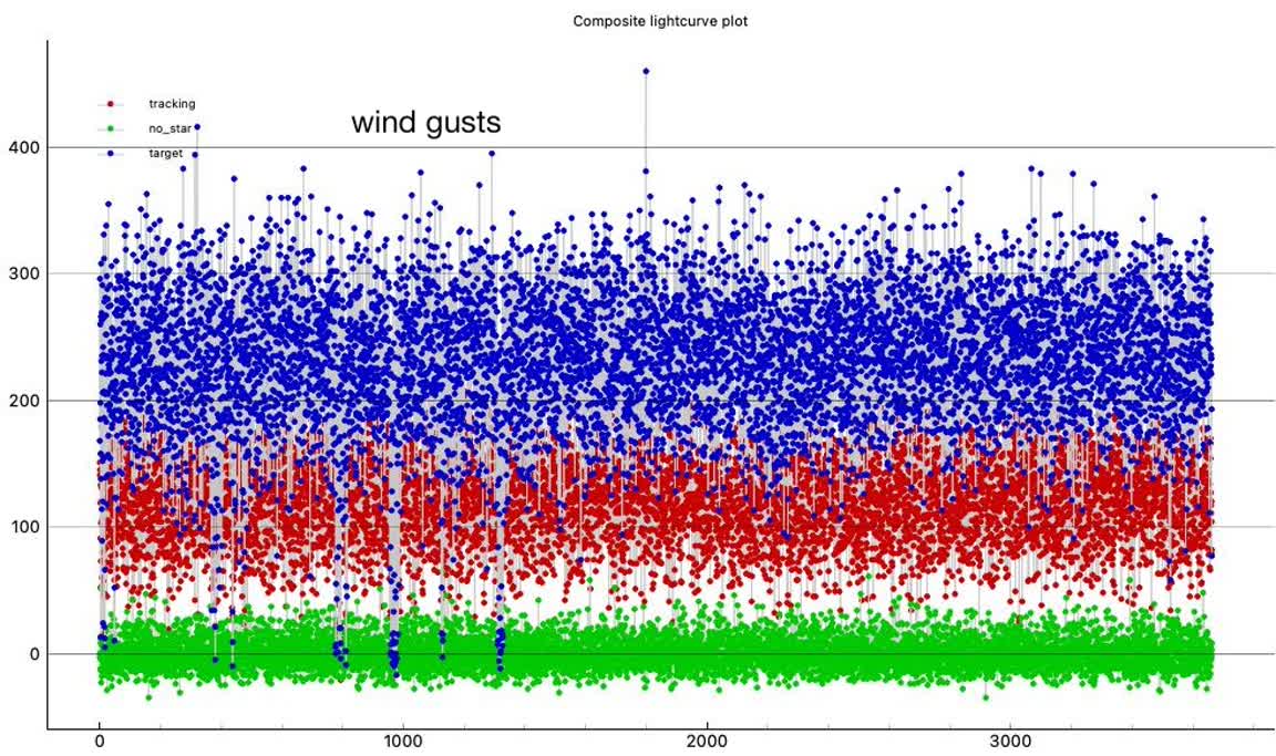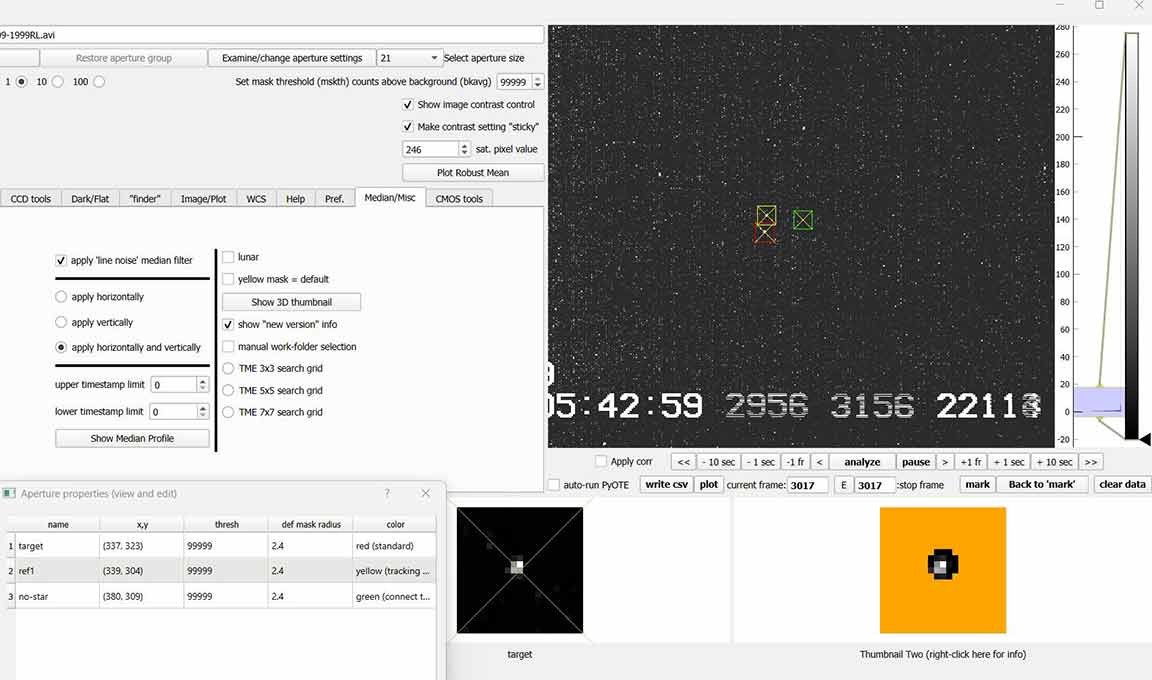 Looks like a miss for me for 1999 RL, 1x at the summit, on the A-frame deck. I know it was close to Rick's chord and he got a positive, but there's no sign of a dip in mine near predicted time. There is a one point upward spike near predicted time, higher than baseline and not part of an event dip, probably just coincidental noise, there was a lot of twinkling. I had some wind gusts at the beginning but it was calmer during the predicted event time. At first I tried all size 2.4 apertures in pymovie, but it lost tracking and didn't recover so I used 3.2 for tracking aperture and then it didn't lose tracking during the recording. I tried dynamic apertures and it lost tracking. Here are annotated graphs, I offset the tracking/reference star vertically for clarity in PyOTE. PyOTE detectability tool reported an event as short as 0.02s would likely be detectable, max predicted was 0.31s.