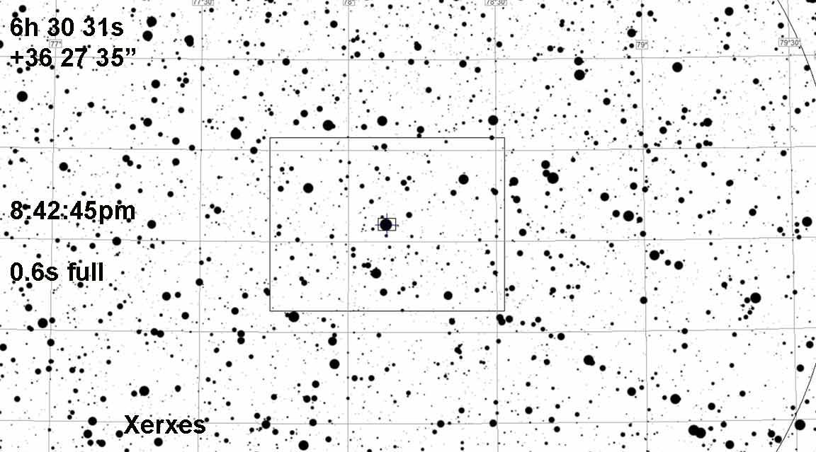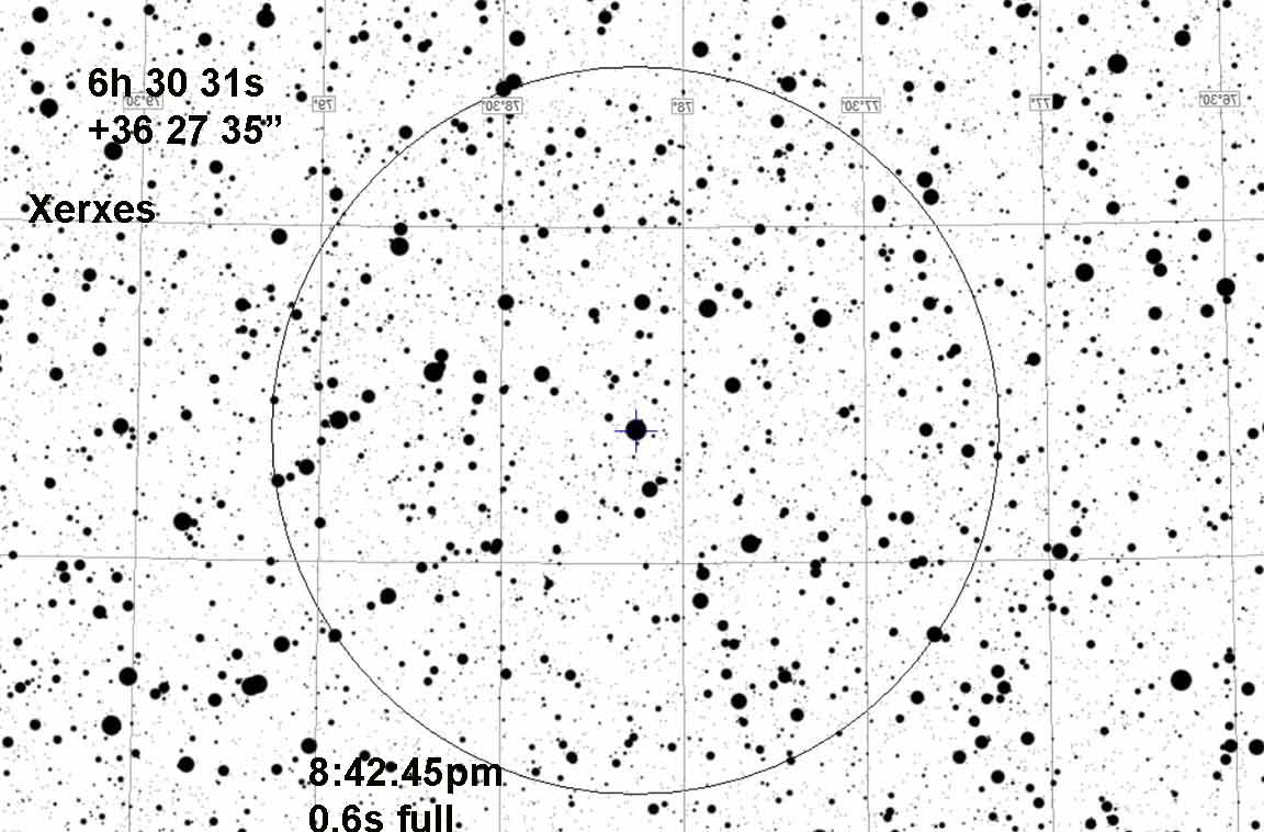 Jan 12 9:42:45 (7211) Xerxes from S of "the rock". Used 1X and gain=35, Clear, dark, still, fairly steady. Saw ~1/4 sec blink. Processing: Target was saturated. Only one other star in field to use as Ref. Tracked on Ref and Target