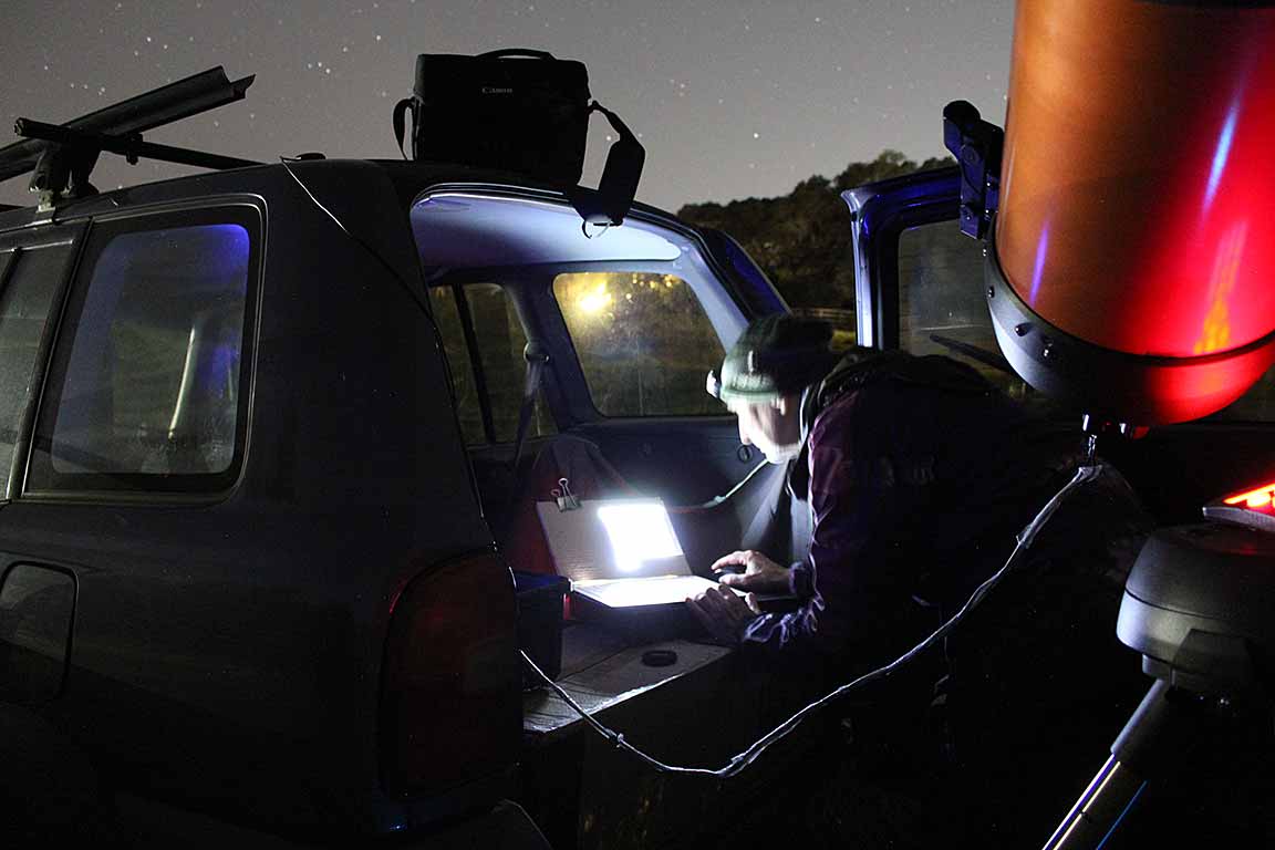 I observed from the same spot I'd used once before, next to the fence of an open field on the north side of Hwy 1 at Larkin Valley Rd. Dark sky there, but the ground was wet, soggy, and deep with natural meadow grass. Not very stable vs what I am used to being able to use. No realistic short-time alternative. Sky was dark, though, and no wind, so in other ways the conditions were good. I was able to get this at 1x easily. It looked visually like it faded to half brightness for 0.5s, but not a full disappearance as was expected. Is this a binary star? I've not reduced it yet