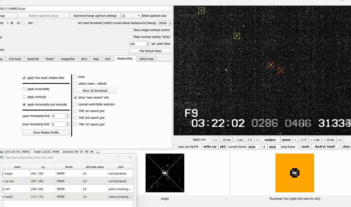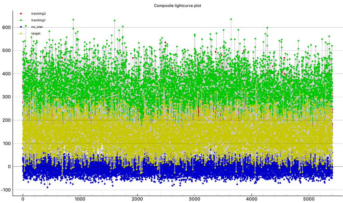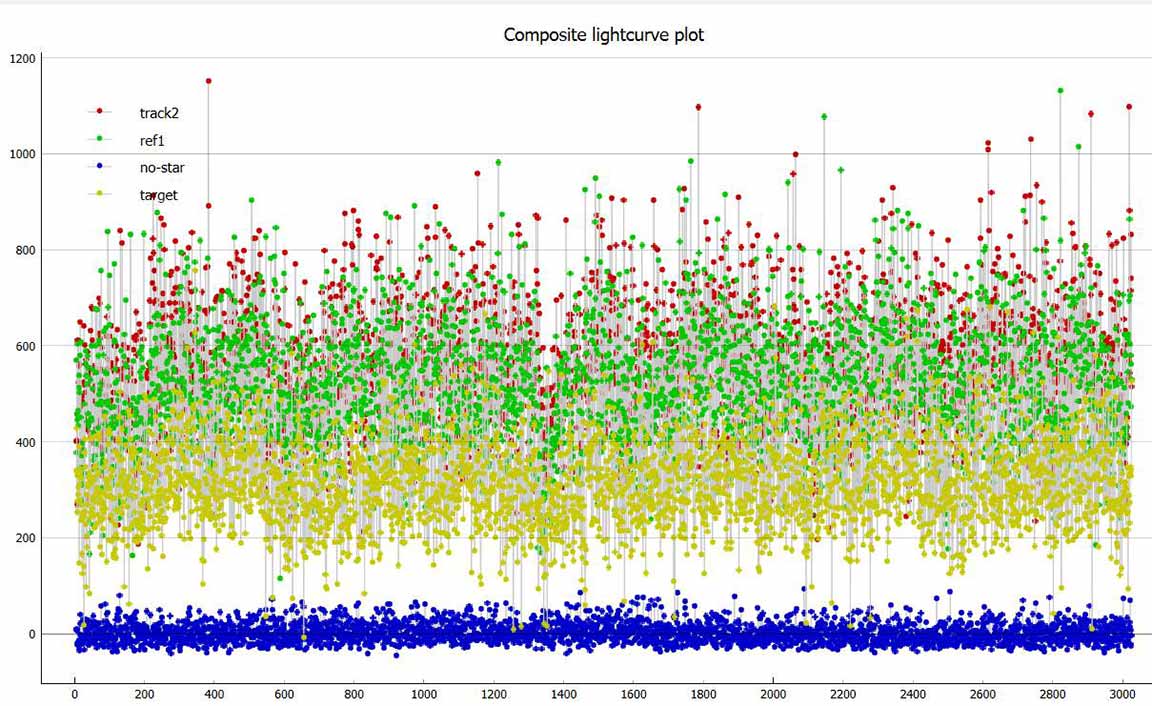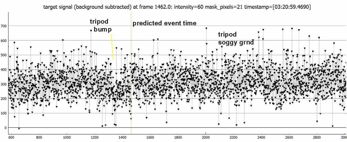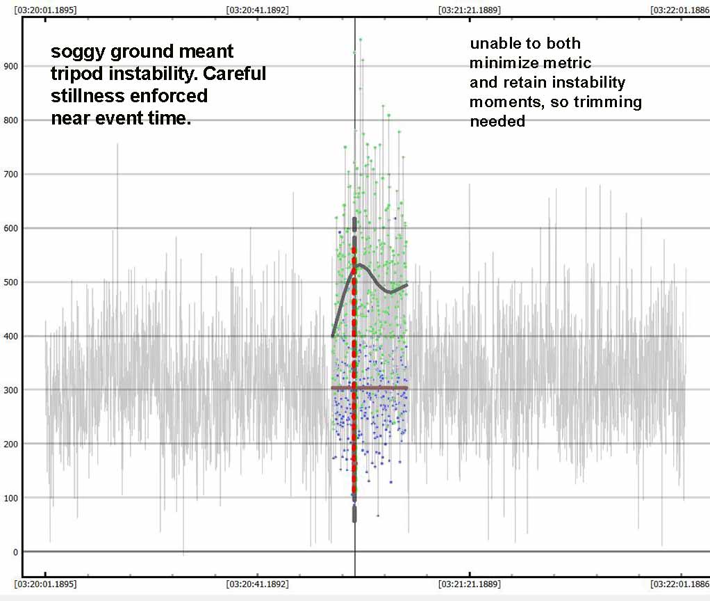 My second attempt, was to choose a better Track2 star, as the first track star hit the chip edge early and required trimming. The second track star did not do this. Still, the seeing was not great in this lower-altitude event, and the event was also short, only 0.20s. Worse, the site was on soggy thick meadow grass and I discovered that even minor movement could cause tracking error. I did expect some of this and so took great pains during the seconds before and after the event time, to be very still. The event was again detected by PyOTE, and the significance NIE was better, at 3.1 sigma. It happened precisely at the predicted time of 3:21:59.50, with the lowest point perhaps being the maximum occultation. Being so short, and noisy, the significance likely cannot be improved. I used the 2.4px size mask, as usually is best. There were a couple of periods of short wisps of aerosol (or more likely, tripod vibration on the soggy ground?) which show in each of the stars' light curves, but because of the noise, they could not be effectively removed and still minimize the metric, and instead I had to trim them out.
