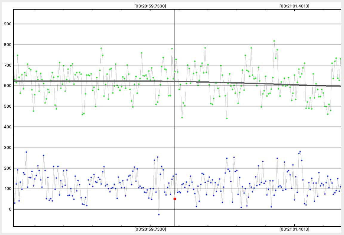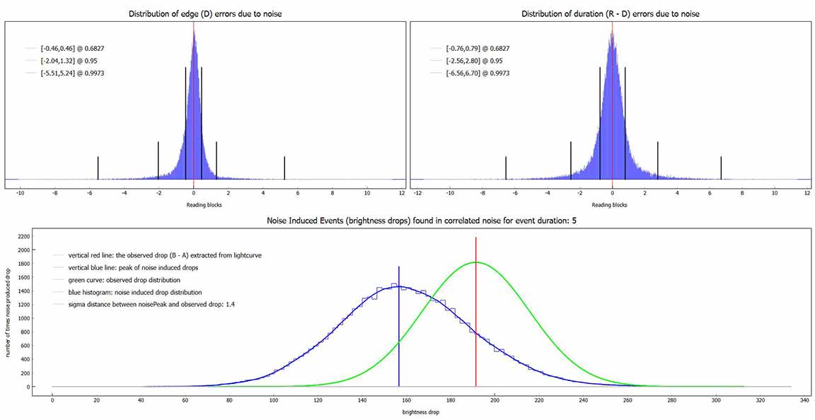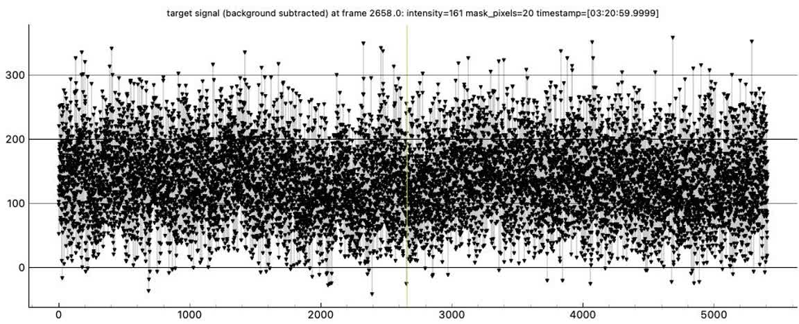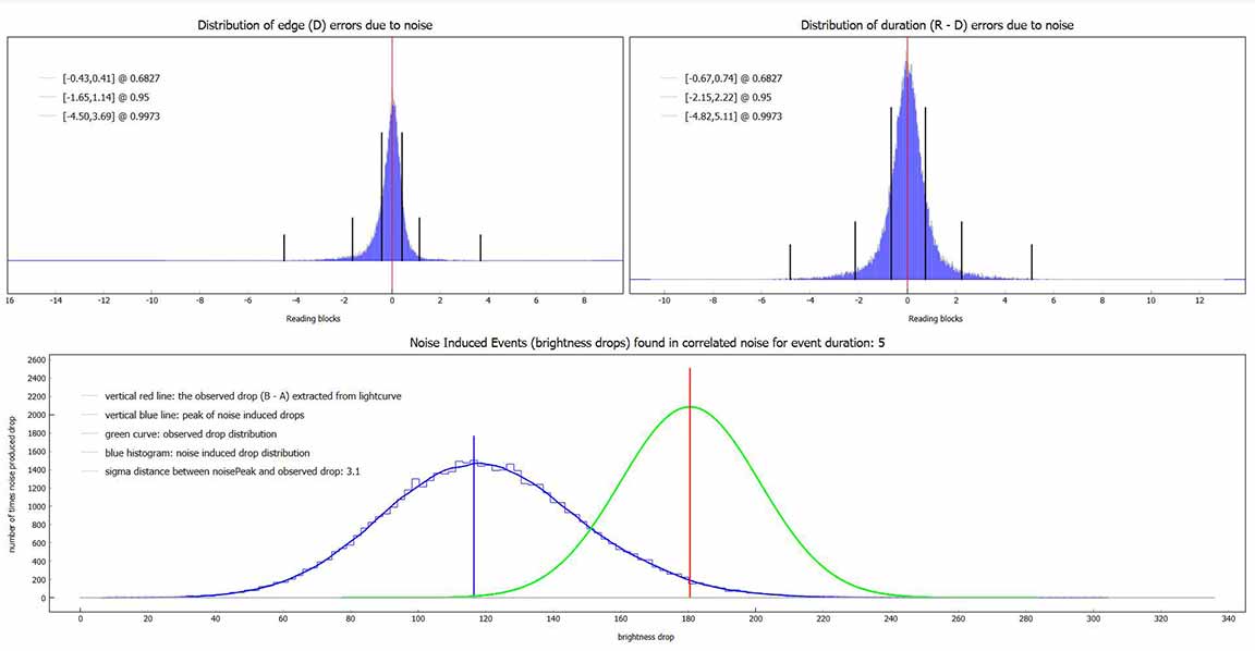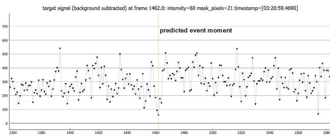 My second attempt, was to choose a better Track2 star, as the first track star hit the chip edge early and required trimming. The second track star did not do this. Still, the seeing was not great in this lower-altitude event, and the event was also short, only 0.20s. Worse, the site was on soggy thick meadow grass and I discovered that even minor movement could cause tracking error. I did expect some of this and so took great pains during the seconds before and after the event time, to be very still. The event was again detected by PyOTE, and the significance NIE was better, at 3.1 sigma. It happened precisely at the predicted time of 3:21:59.50, with the lowest point perhaps being the maximum occultation. Being so short, and noisy, the significance likely cannot be improved. I used the 2.4px size mask, as usually is best. There were a couple of periods of short wisps of aerosol (or more likely, tripod vibration on the soggy ground?) which show in each of the stars' light curves, but because of the noise, they could not be effectively removed and still minimize the metric, and instead I had to trim them out.