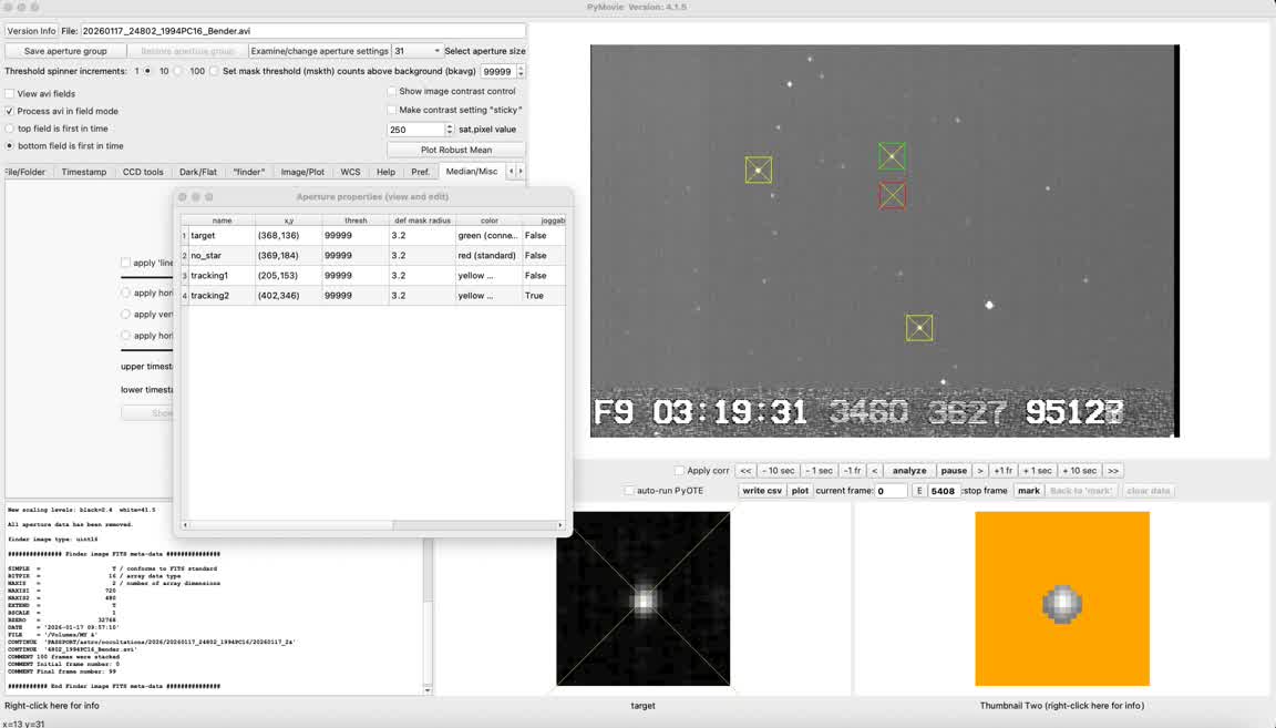 Kirk Bender's miss, from nearer the northern limit, together with mine, suggest a significant south shift and I got only a bit of the asteroid, not the 0.4s duration predicted. The two runs gave identical timings, but slightly better timing accuracies on the second run, and higher NIE test sigma results.