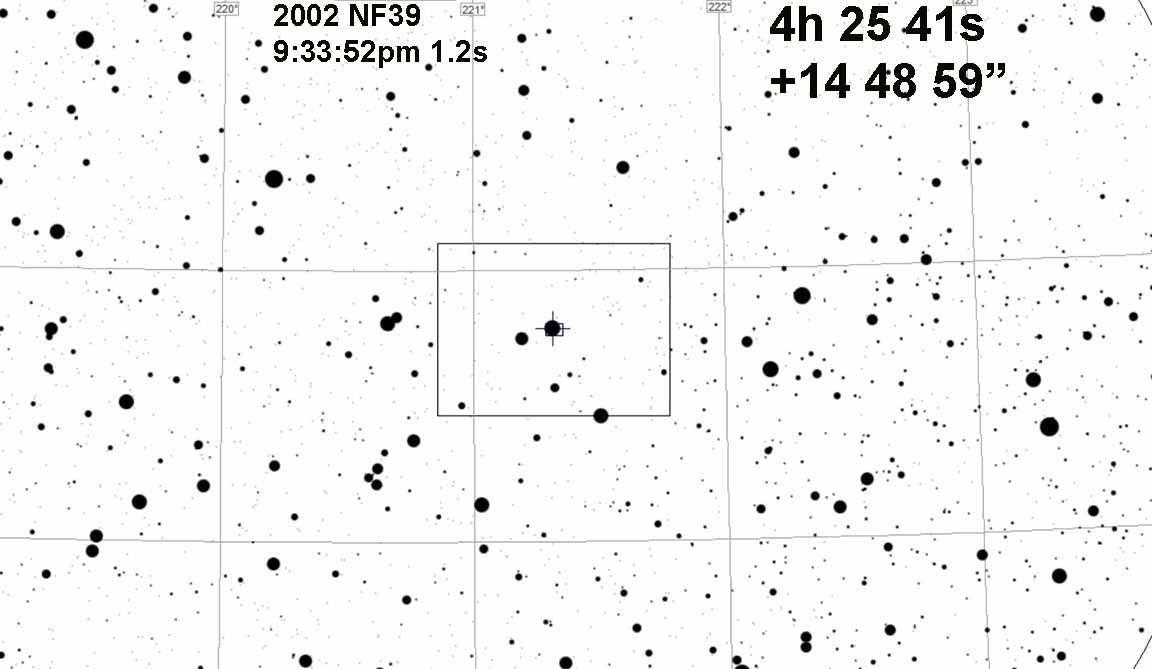 Jan 28 9:33:52 (203688) 2002 NF39 S of Rock 1X, clear, bright moon, med. seeing. (Telescope tracked w/o correction for 1.5 hours!) Star was very bright. Only one other (dimmer) star in field. Put slightly out of focus. No visible blink. Processing: Anomalous sharp deep dip for .0434sec. , Target and Ref stars wandering out of their boxes.Finally used dynamic mask aperture with aperture size of 71 and mask size 6.0 for target and Ref1 stars. Finally got no event, which was what I saw even when stepping through recording frame by frame. Reported a miss.