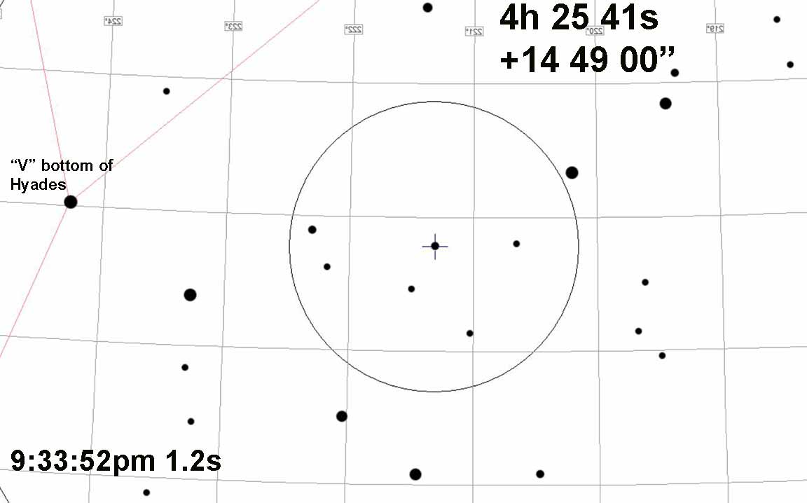 Alt=60, Az=229 in Taurus, in the Hyades Star Cluster, 3 degrees left of the apex of the "V"