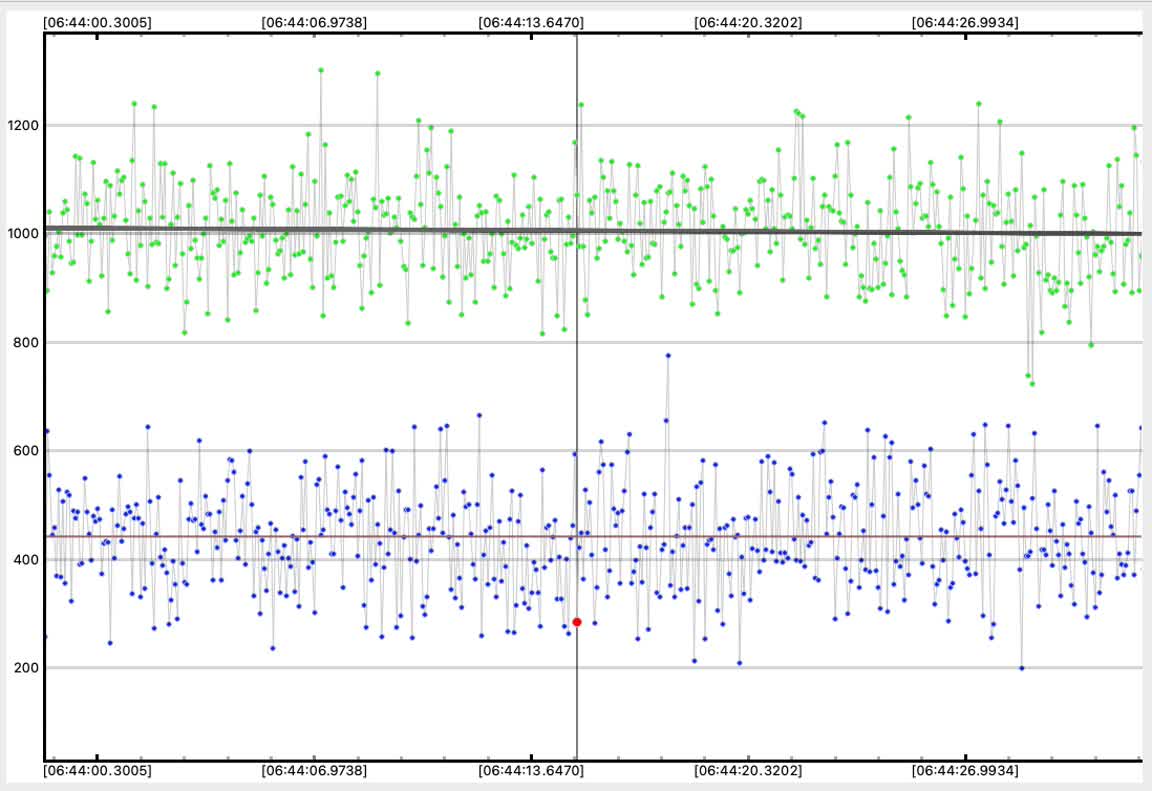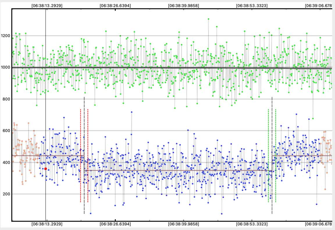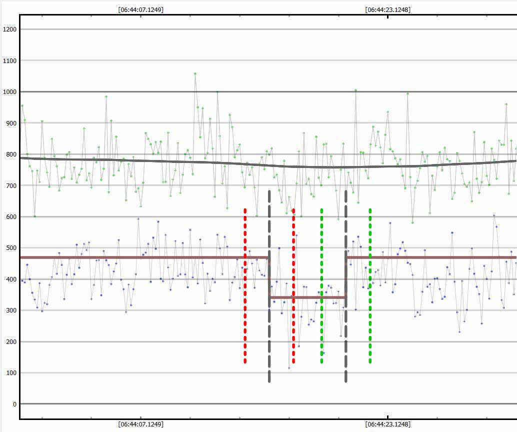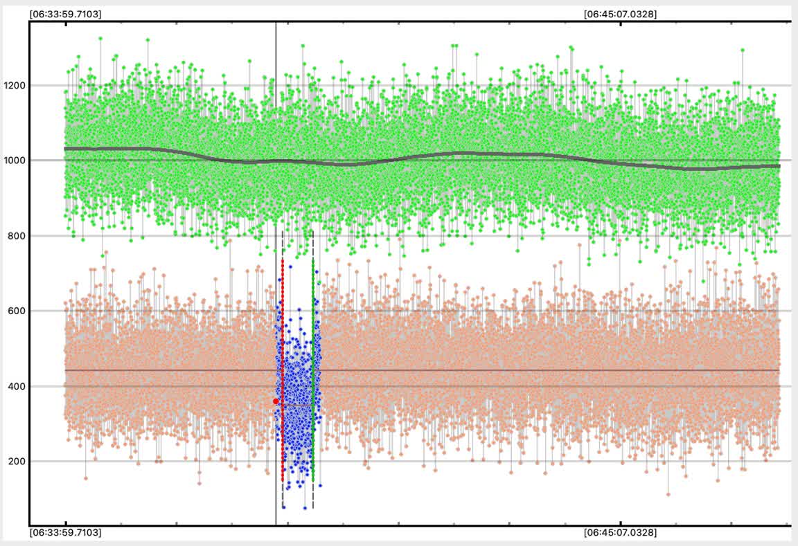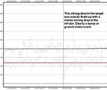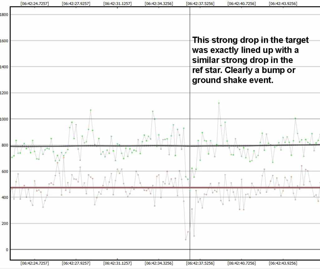 By contrast, here is the other dip in my data which first caught my eye. But note the ref star has an ~identical dip at the same moment - so this is a momentary loss of tracking or other noise. It is not an occultation. |