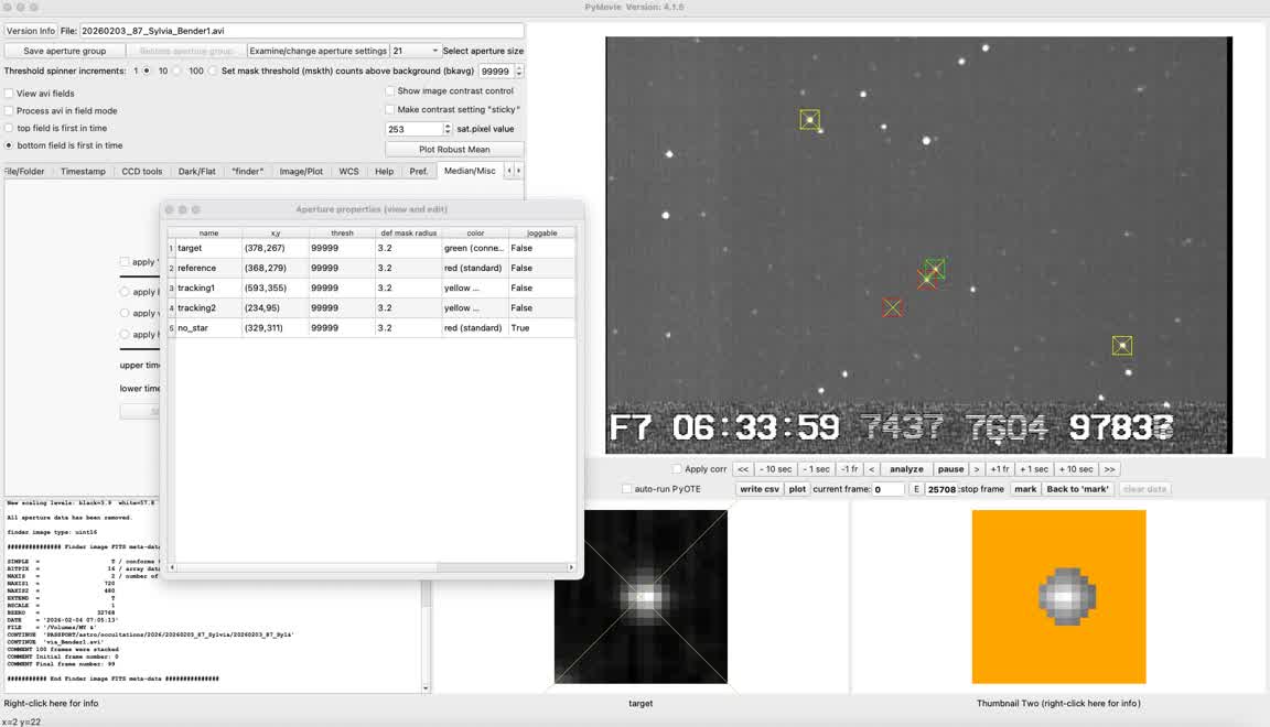 Second, the duration of my event = 4.95 s, is 7.6% of the duration of the main body Sylvia, which has a stated shadow diameter in OWc of 267 km. That corresponds to a moonlet chord length of 20.3 km. Impact angle probabilities for a circular profile are such that this is not far from the maximum, i.e. is roughly the diameter of the possible moonlet. The separation between Kirk's and my tracks was 8.04 km. So if the center of the possible moonlet was just a km or more south of my location, it would be a grazing miss for Kirk. So Kirk's non-event doesn't have much constraint on the reality of this possible secondary event. Kirk's Astrid set up at home, unattended, was untracked and the target drifted out of the field before this secondary event, unfortunately.