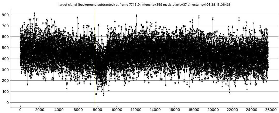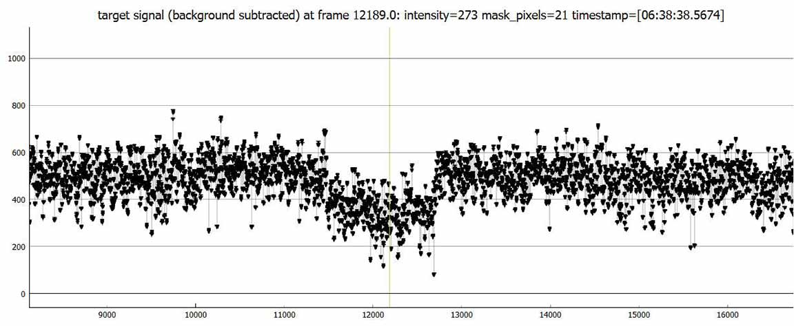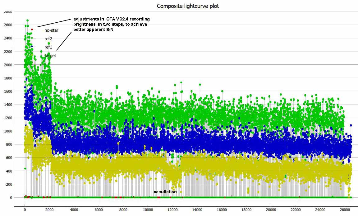Reminder: in the light curves below, the two early drops are due to adjusting the recording brightness and contrast levels in the IOTA VC2.4 software. They are not caused by anything in the sky. Those recording levels were not changed thereafter.