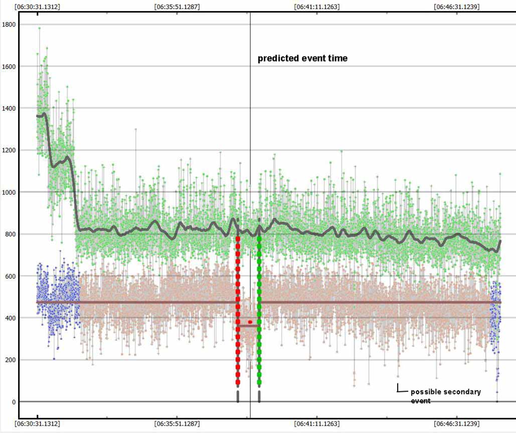 Kirk Bender was only 8 km north of me and yet had a much shorter 37s event, vs my 49 sec nominal event detection below.