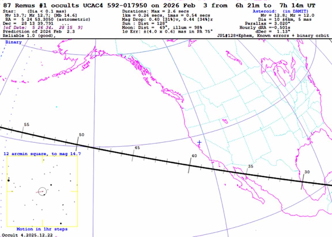 Decently visible star, very long duration, quite do-able, and far from the big moon. It's a known triple asteroid with 2 moons. The moons are most likely south of the main body which means we're unlikely to see either of those moons. We're inside the northern limit, with a likely duration for us of more like 15 seconds or so. The drop is 0.4 magnitudes so that's a bit subtle to see visually, but with a reasonable integration of 4x or 8x, will be quite easy to see for the long duration as compensation. As a triple asteroid, it's a high value target since we can refine the orbit at least with the primary member of the system.