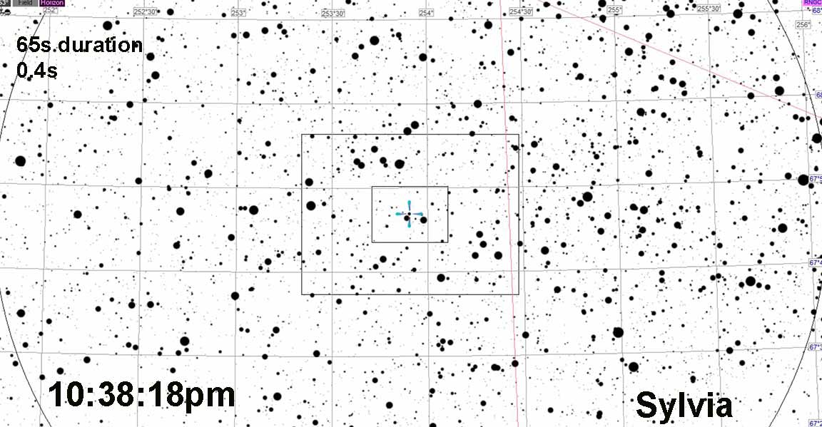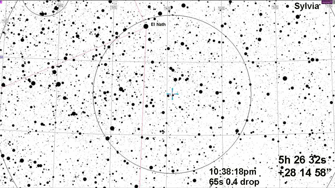 I got a 36.7028s event for Sylvia, 4x on the 8SE at Skypark. I don't see any secondary events. I'm attaching part of the PyOTE graph zoomed in at 06:44:15 where Rick suspects a second event. I also recorded at home on the Astrid with the 80mm scope, I haven't reduced that yet.