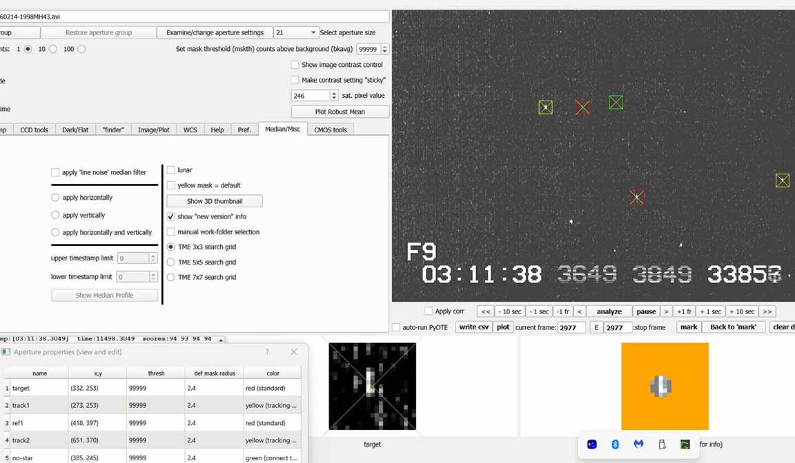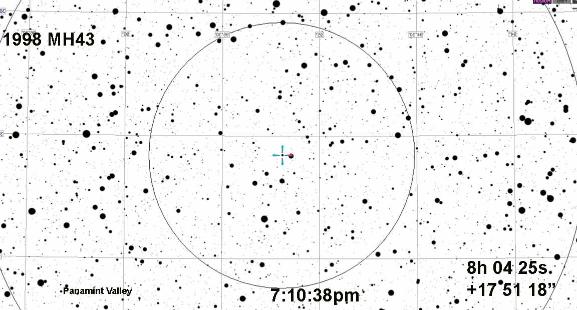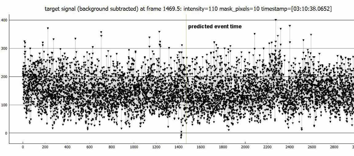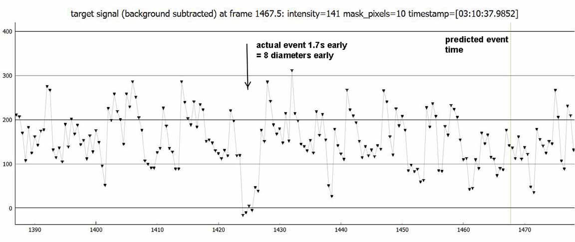 Remarkably, the path seemed to be quite accurate in a north-south sense, with Kirk getting a 0.20 s event from the centerline, as predicted, and I got a 0.09s event from near the northern limit. But the event was 1.7s early, which is 8 diameters early. The predicted event time was (rounded to the nearest second, as OWc does) 7:10:38pm PST.