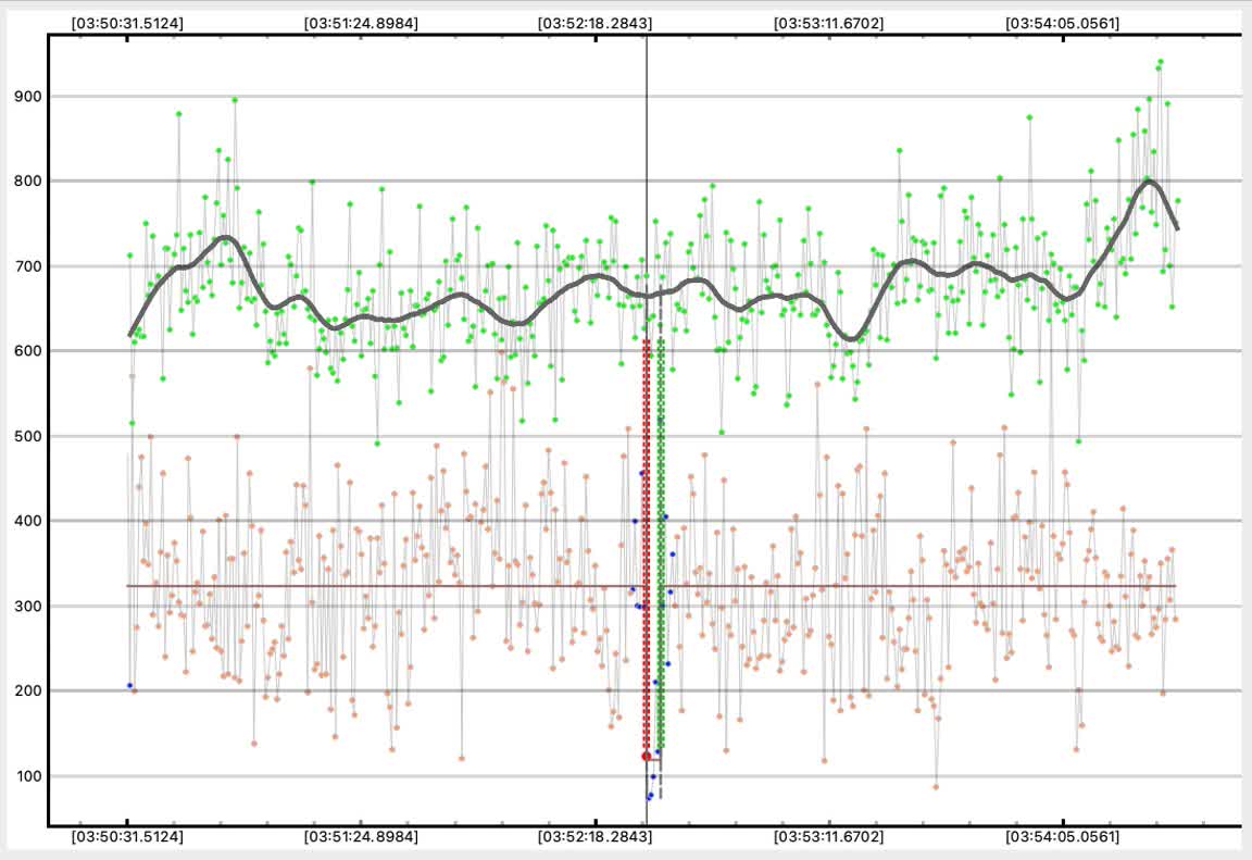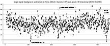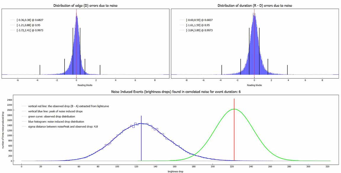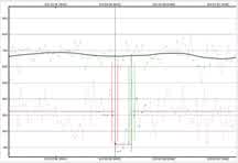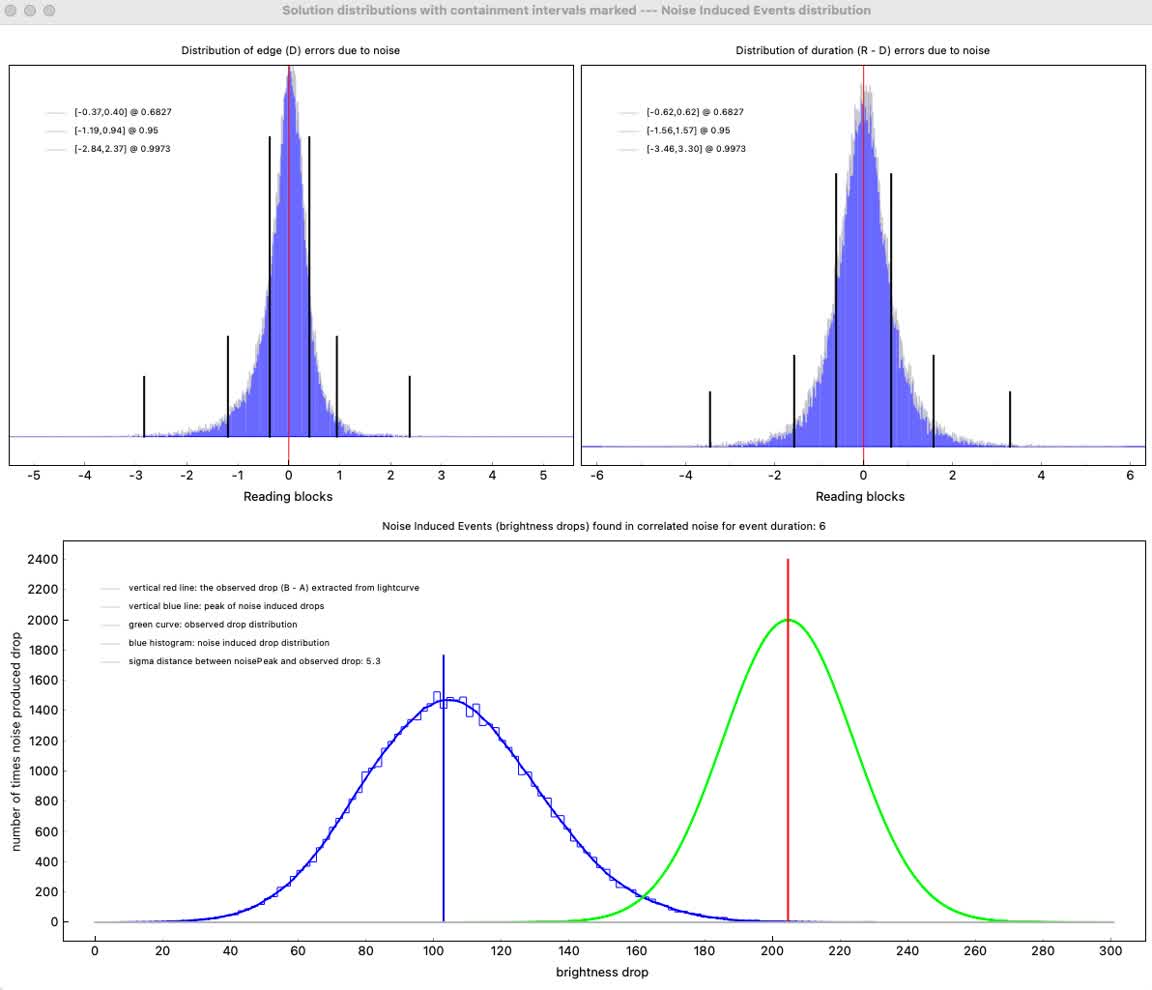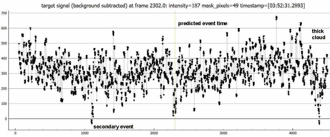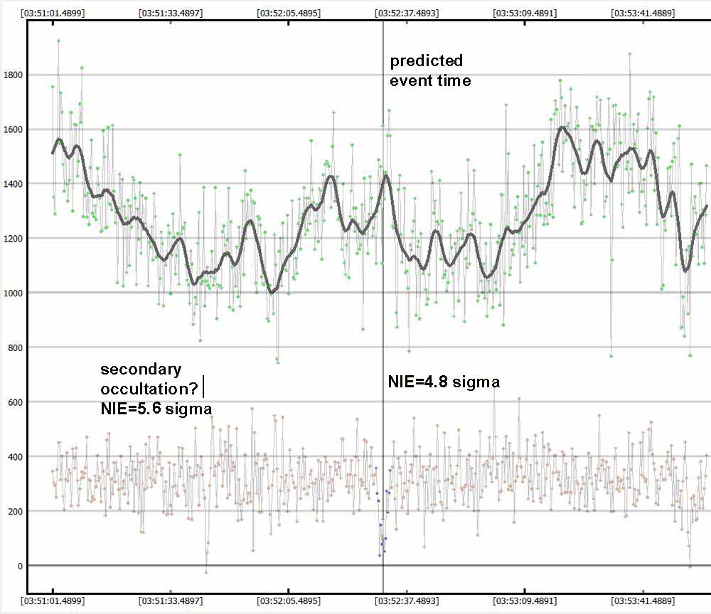 An apparent event occured 1 min 50s earlier than the main event. 3 consecutive low readings. I got intrigued, late at night, that this might be real, and got into calculations to judge its plausibility. I didn't do the most obvious observation data check until after this, the next day. But anyway, this was educational and so I am leaving this in the webpage.