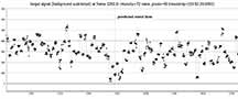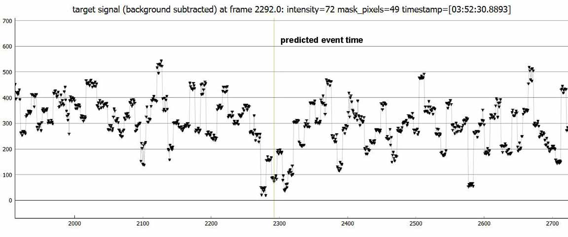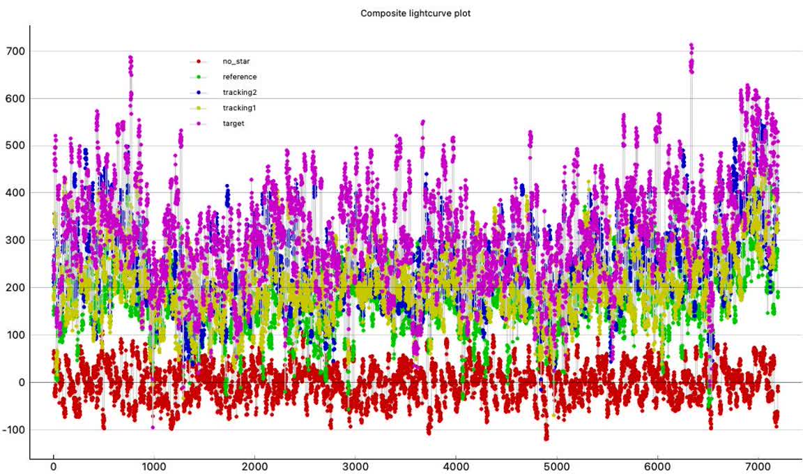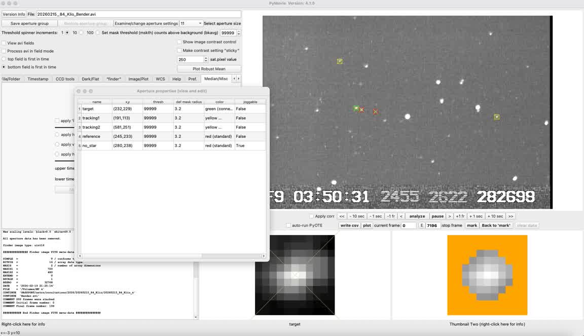24 frame finder begun at the time stamp below, which matches well with the beginning of the 0.96s 3-integration low points suspected as an event. The target star is quite normal. It appears to be a perhaps bit of wind that manage to un-track the target but not un-track the brighter tracking stars or else move them in such a way we had a loss of tracking, is my guess. Whatever the cause, the target star is still there. I will leave the above as a nice bit of science down the rabbit hole that may be useful for future reference. But, follow up for a moonlet is now unwarranted. |