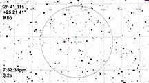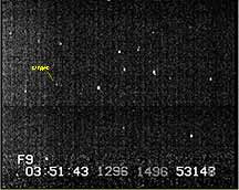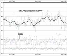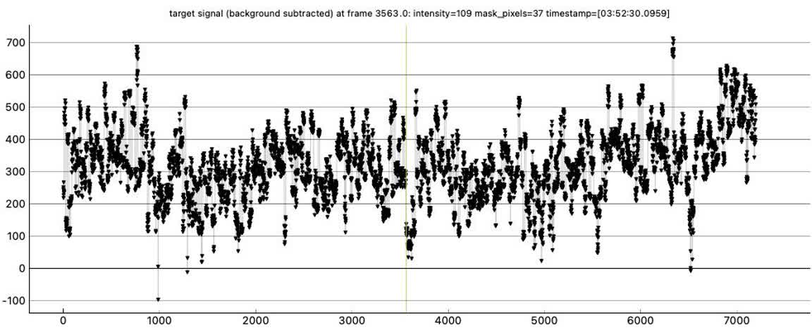 Now, having done all this.... an acid test on my own data should be to just see if the target is "normal" during this 1 sec of the occultation. On this measure, this event fails. I got intrigued by the calculating because I knew how to do it and just try and judge plausibility in this way. But... if you look below you see the PyMovie "finder" image with 24 frames = 3 full integrations starting at the time stamp below, which is about the right moment for the first of the 3 low points. I see the target star just fine, at normal brightness. So, it appears to be some form of noise or tracking momentary error (wind?).