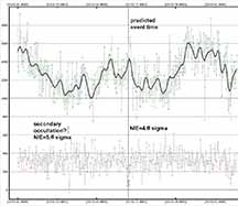 This event was 46.25 diameters from the primary occultation. Is this possible? I use physical characteristics of Klio from Wiki here. and the on-line Hill Radius calculator. The result is that R_H = 10,967 km = 133 diameters. Note however that the mass of Klio is quite uncertain since the density is uncertain. If this is a new moonlet, it offers the possibility of determining the mass accurately, once the orbit is determined. The diameter of the moonlet is 0.96s / 3.2s or 0.30 x primary diameters. This would make it about 2.6 magnitudes fainter than Klio, and at a large enough separation and bright enough that it should be straightforward to see in images. The magnitude of Klio was V=13.9, so the moonlet would be about V=16.5 magnitude or brighter, if the same albedo as primary. The diameter of Klio is given on OWc as 52 mas, and so 46 diameters away is 2.39 arcsec, well within the resolution for a good night at MIRA. Perhaps even do-able with a good camera on a 10" scope if a location at good seeing is used, like Bonny Doon.