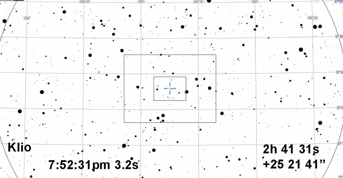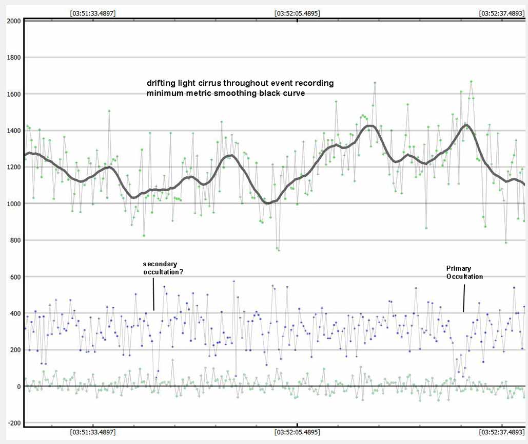 Kirk Bender observed at 32x, so my 3 points would merge to ~1 point on his recording. Our cross path distance was only 1 mile or 1.62 km. The shadow for Klio was 84km, and the inferred diameter of the moonlet is 0.3 x 84 = 25 km or more, so Kirk and I were close enough that we should have both seen the same event with very similar duration in time.