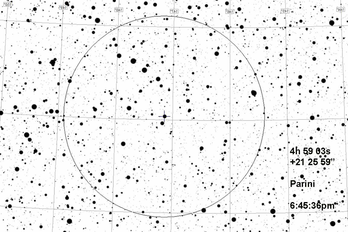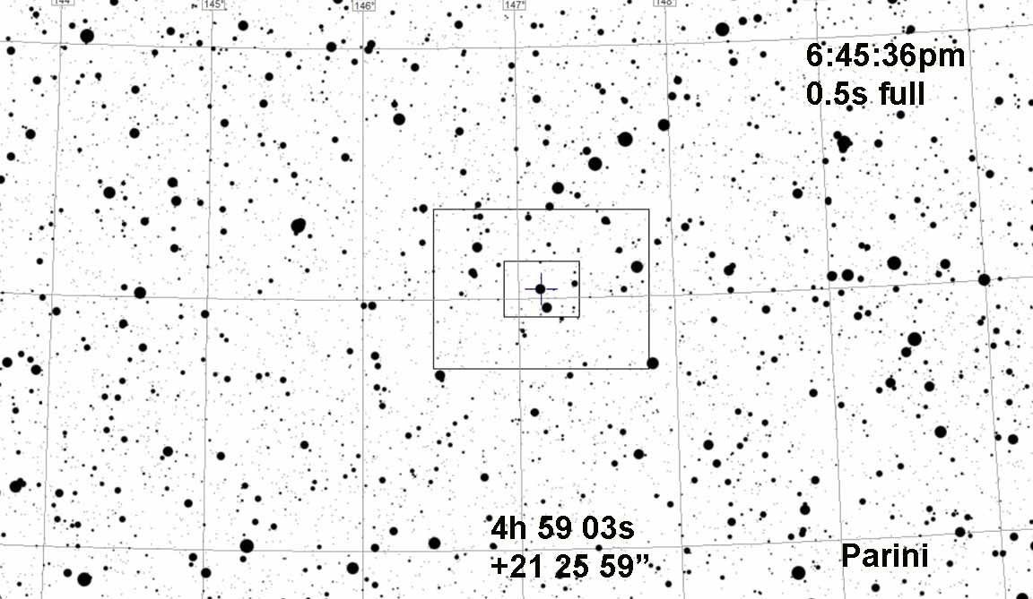The last minute clouds looked to favor going to Felton for this, and also saving driving time. I got back from errands later than I hoped and it was a mad dash. I'd hoped to enlist Kirk, but I didn't contact him in time. I drove up Graham Hill to set up at the green belt park access across from the Safeway. What I didn't expect, was the nightmare clog of rush hour traffic returning from over the hill. Stuck in long lines behind red traffic lights and I could see I'd miss it if I stayed. Desperate to set up SOMEWHERE that I could park, I managed to do an illegal exit and ended up in the liquor store parking slots in the Safeway shopping center. I got set up in a hurry, no time to try to locate the target area in the brilliantly lit parking lot in the eyepiece, so after the GoTo I went straight to the Watec. Took about a minute or two to ID the stars, and the target was not on the chip. I got to it in time, started recording at 2x and left it there. The occultation was about 1/2s and easy to spot live.