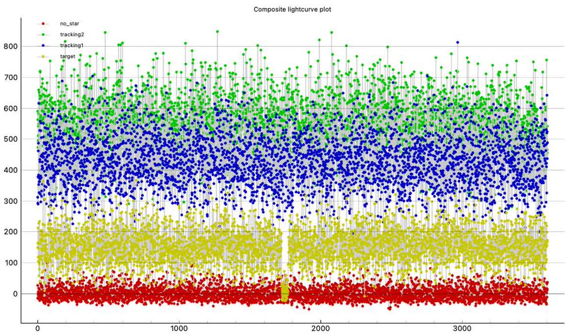 I set up at the Shark Fin Cove parking area, 35 ft north of the notch where the trail starts in the cliff side. There was wind, so I positioned my car to minimize its effect and it was not a serious problem. Observed at 2x. One gust of wind early on caused a drop in all stars very briefly. It was trimmed out in PyOTE before solving.