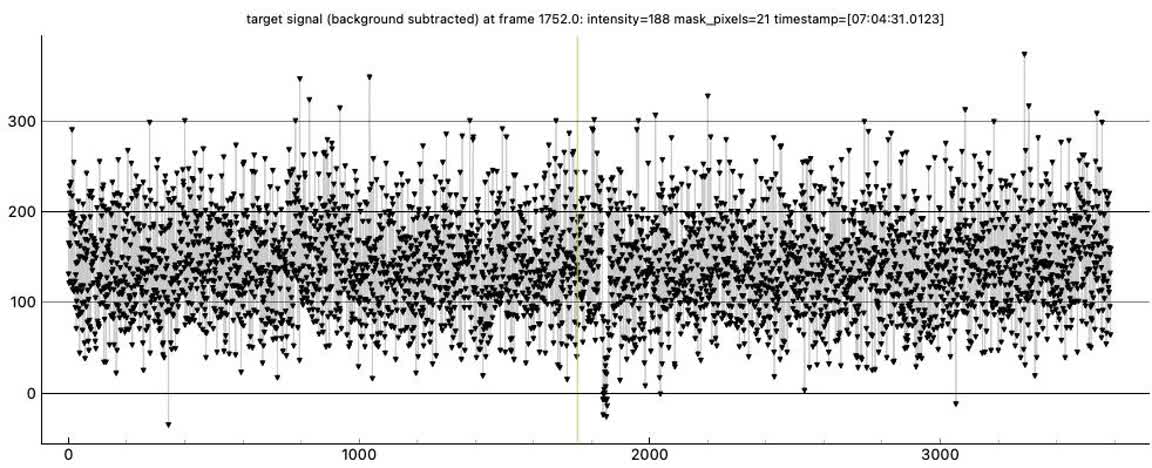 3/15/26: Reduced. Got a definite 0.24s event in good agreement with Kirk's event time. A full 3 seconds after the predicted time. That's 6 diameters of the asteroid. That's a lot, and so we were very lucky that nearly all of that big error was in the along-track direction. A little were in the cross-track direction and either of us could have had misses.