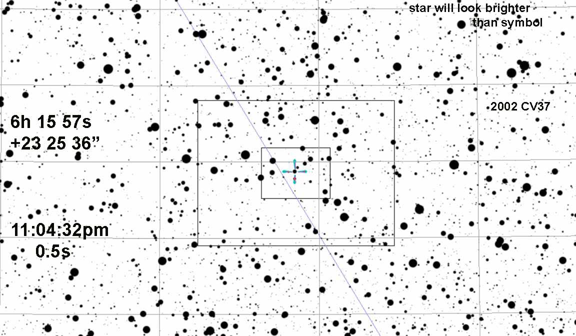I got a definite 0.5838s event for 2002 CV37, 2x from Deerfield Dr. in Scotts Valley. The midpoint was 7:04:34.2070, 3 sec later than the predicted 7:04:31