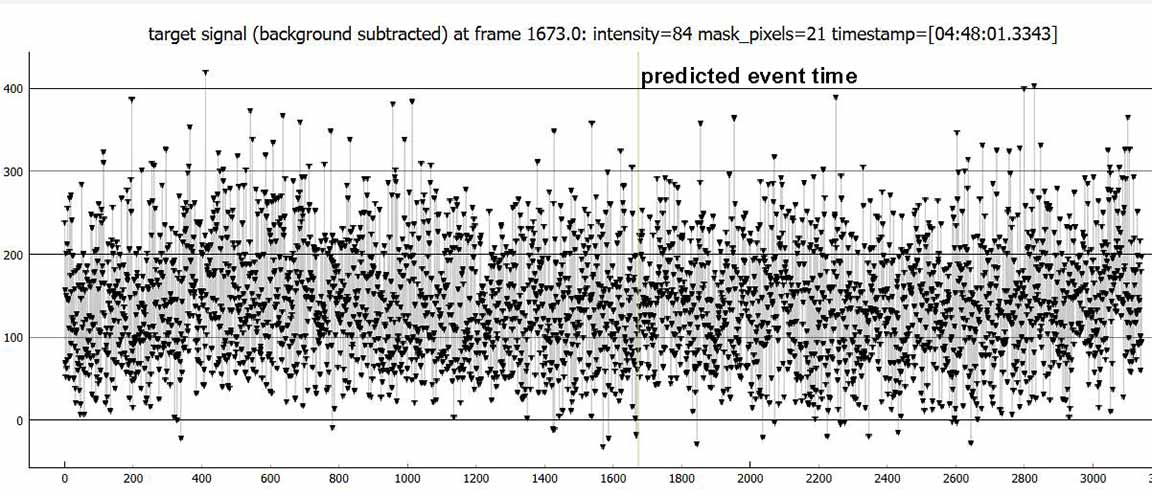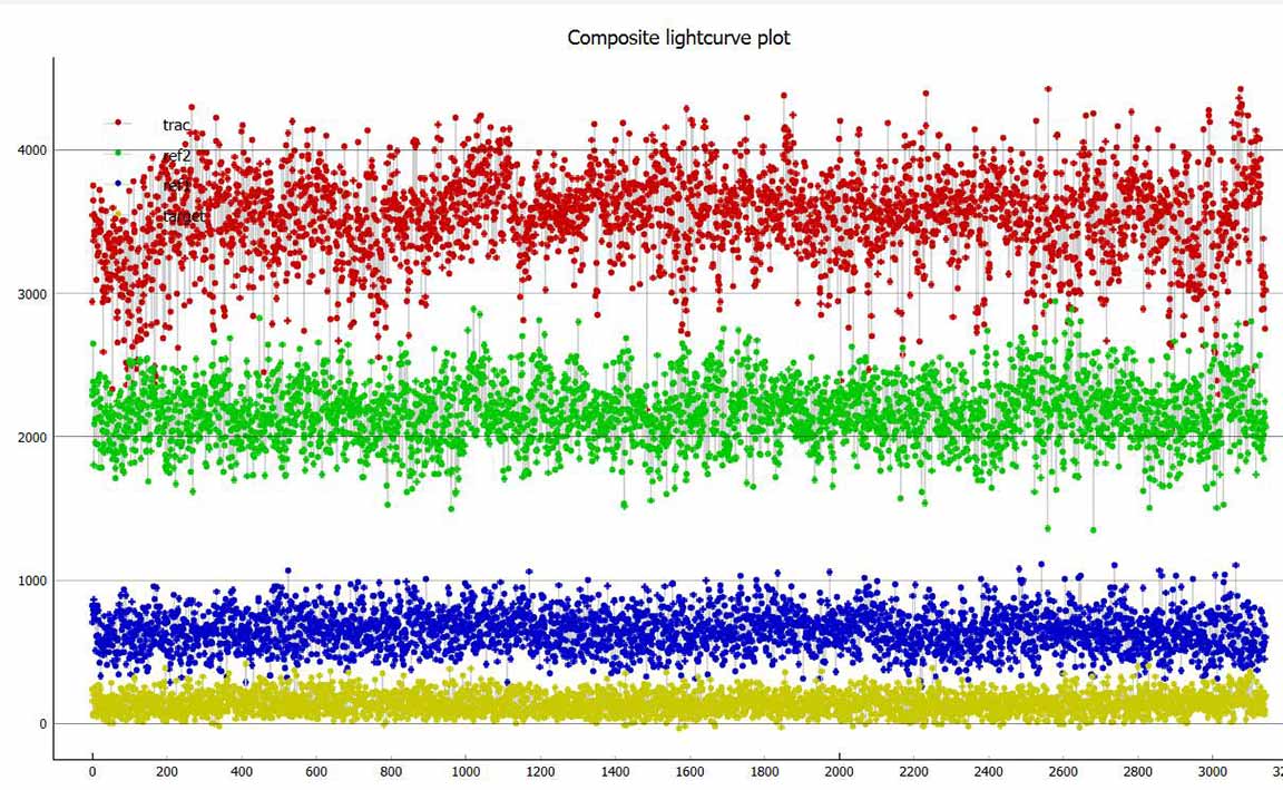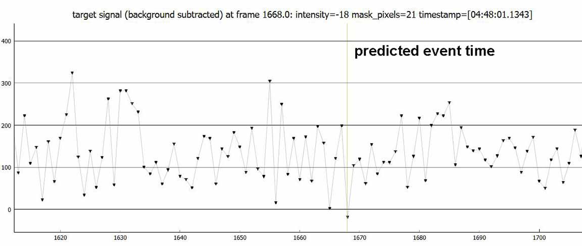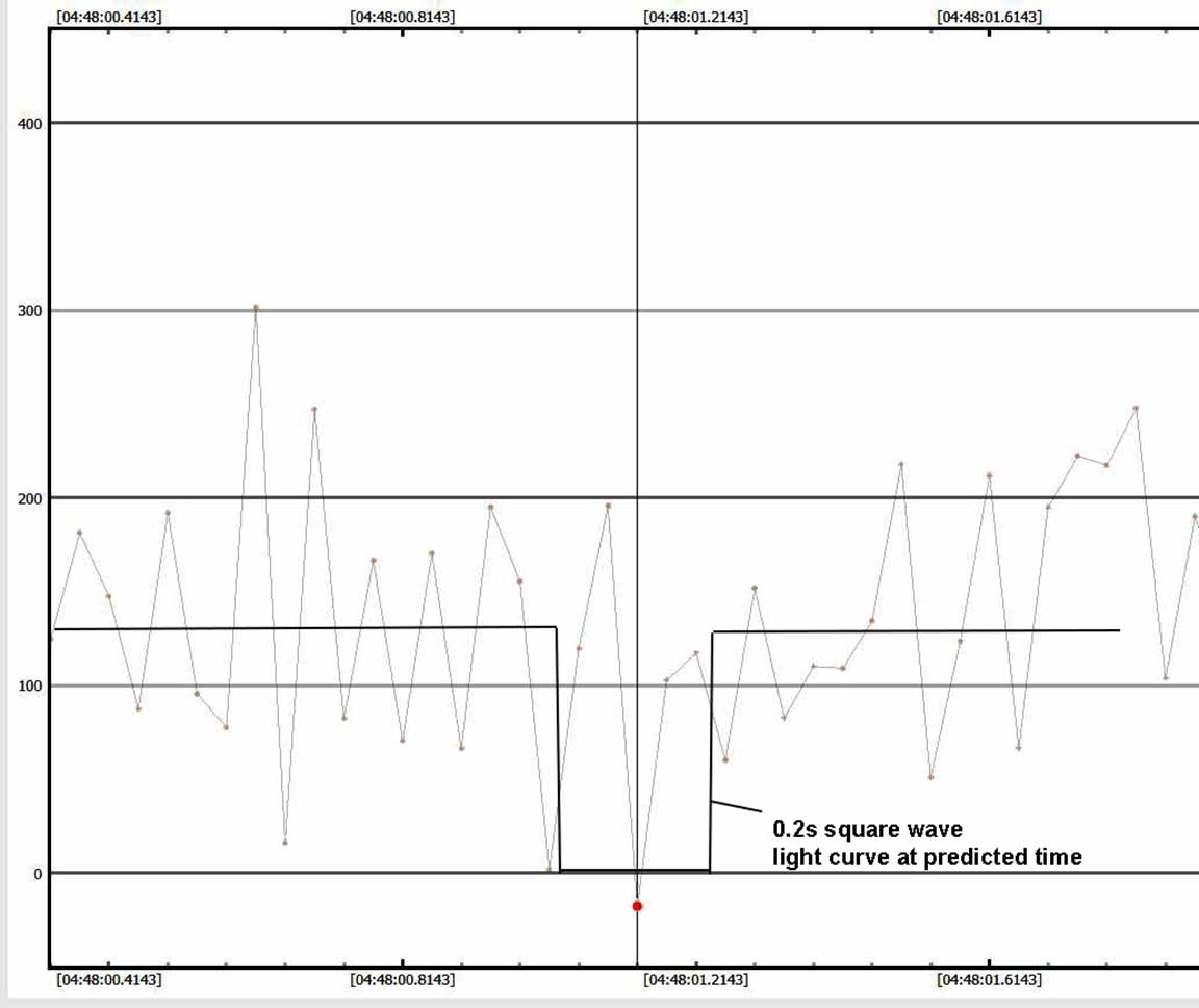 I observed this from home. Skies were clear. I set up at the foot of the driveway, at 2x. Good skies, and I was able to record at 2x, although the target was quite faint it was there pretty reliabily on almost every frame. A 0.2s event would have given 5 consecutive points at zero. In fact, I got only 1. It's a probable miss, but there is a zero point right at the predicted time. But there were many other single point zeros, and PyOTE said my drop was not significant. So, probable miss, but unsure. I'll file it as 'miss' and 'unsure'.