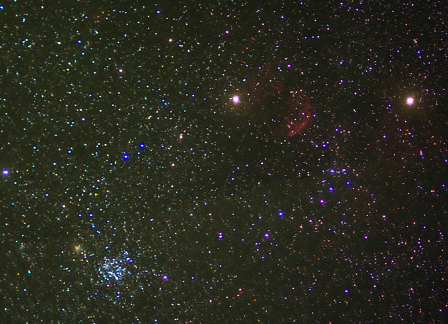 The Jellyfish Nebula and M35. 9x5min stack in Registax 4, after dark subtract and flat fielding. Cropped, and the usual Photoshop CS2 / Astronomy Tools adjustments. Some tilting in the focal plane added to the UV leak problem. And, some warping appeared with the last two frames which had yet a third UV filter stacked on, so the stack isn't perfect. Not a great photo, but it is what it is... |